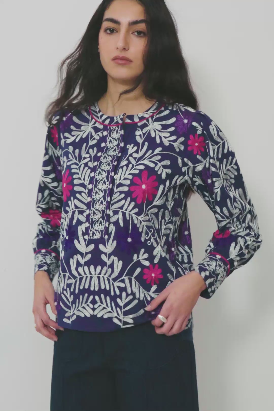 Rica en detalles y con trabajo artesanal, la blusa Nocturn está confeccionada en 100 % algodón y rematada con un bordado bordado floral sobre una base azul índigo. Creada mediante un preciso proceso de bordado a máquina que tarda aproximadamente de dos a tres horas por pieza, refleja un enfoque artesanal meticuloso. De corte relajado, presenta detalles refinados, como una delicada botonadura frontal y ribetes en contraste en el cuello y los puños.