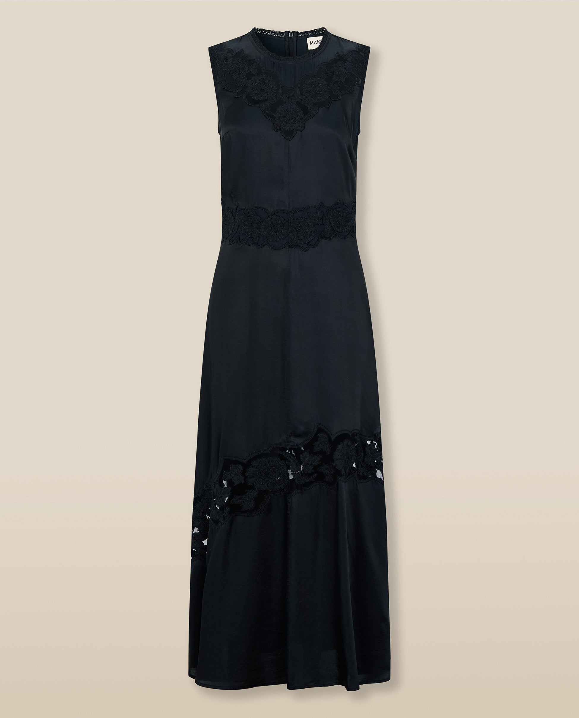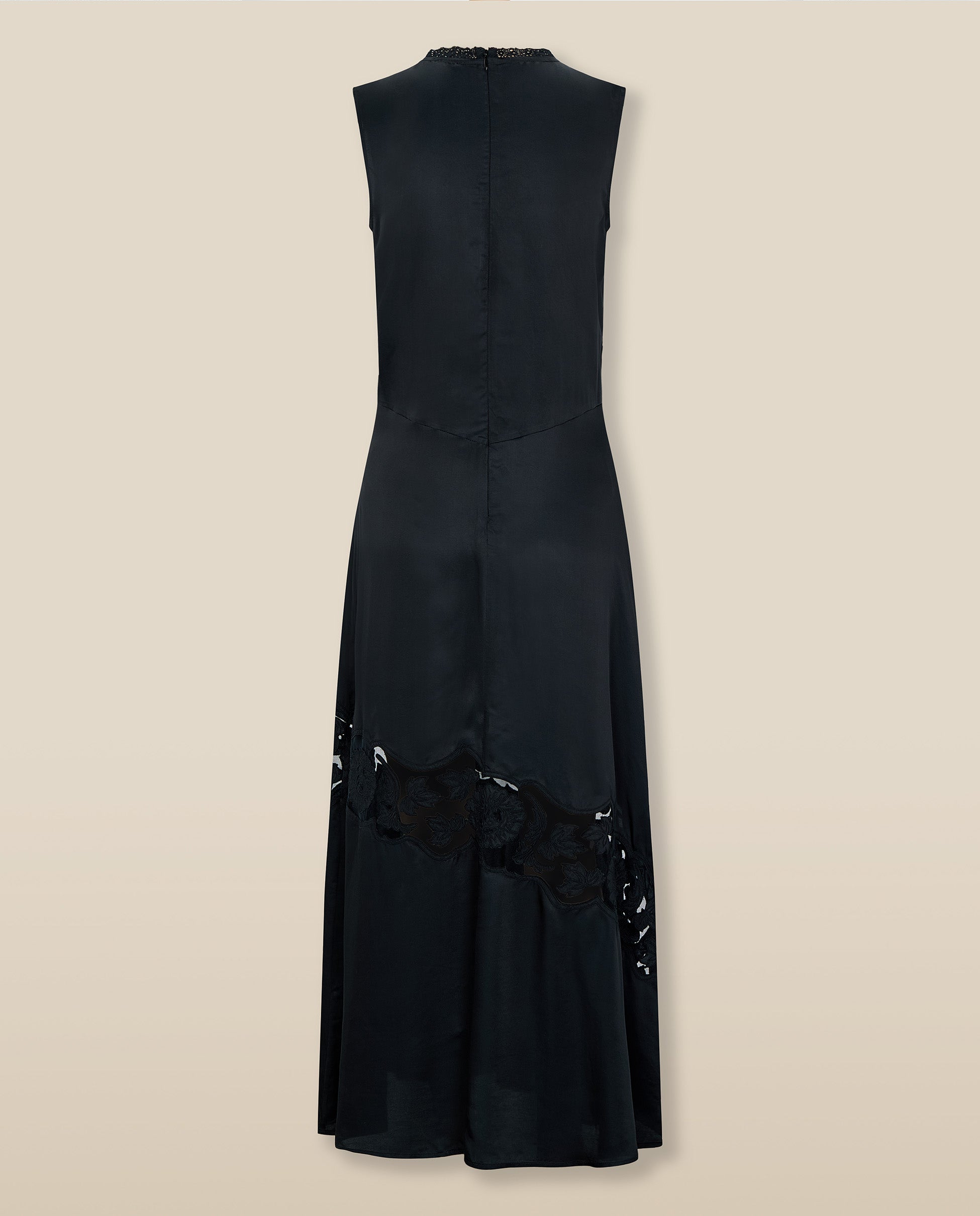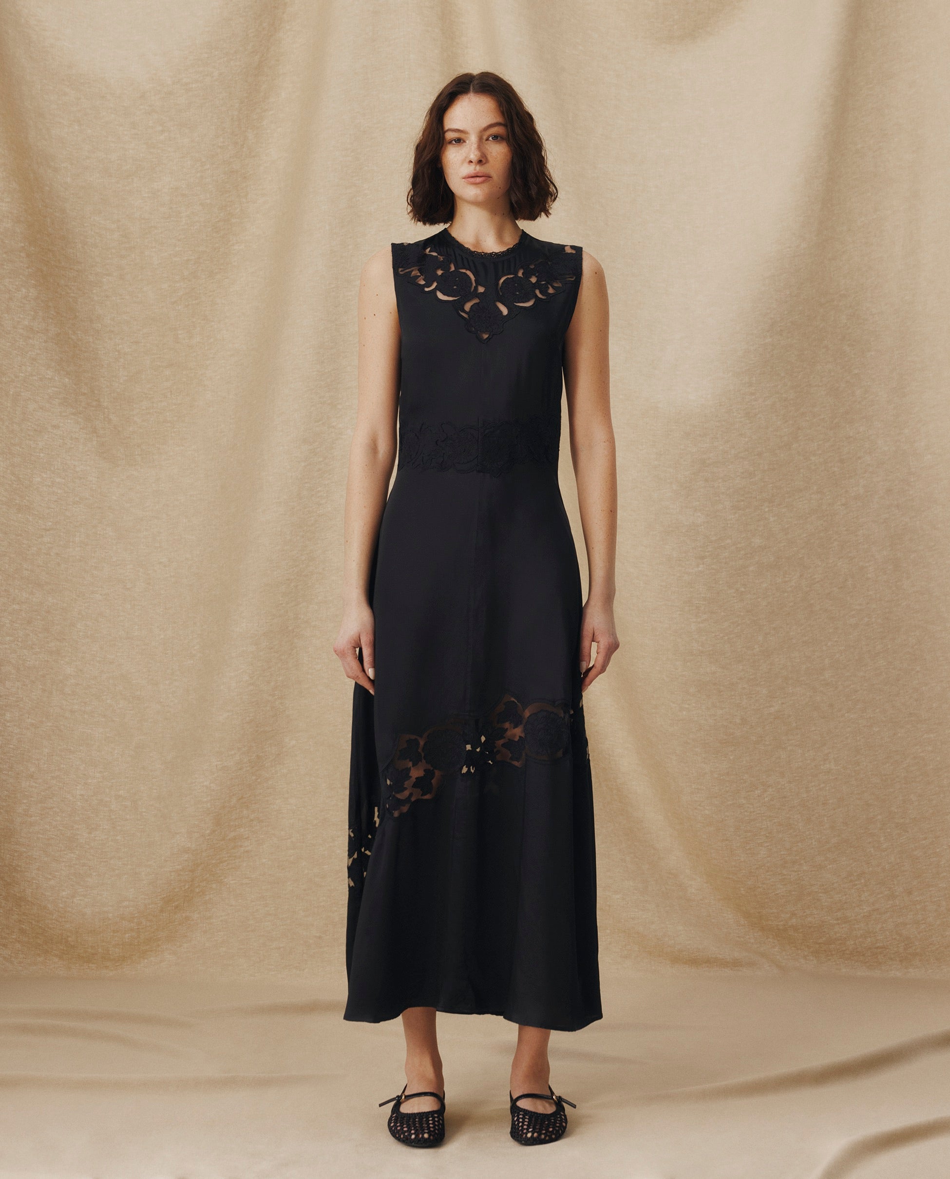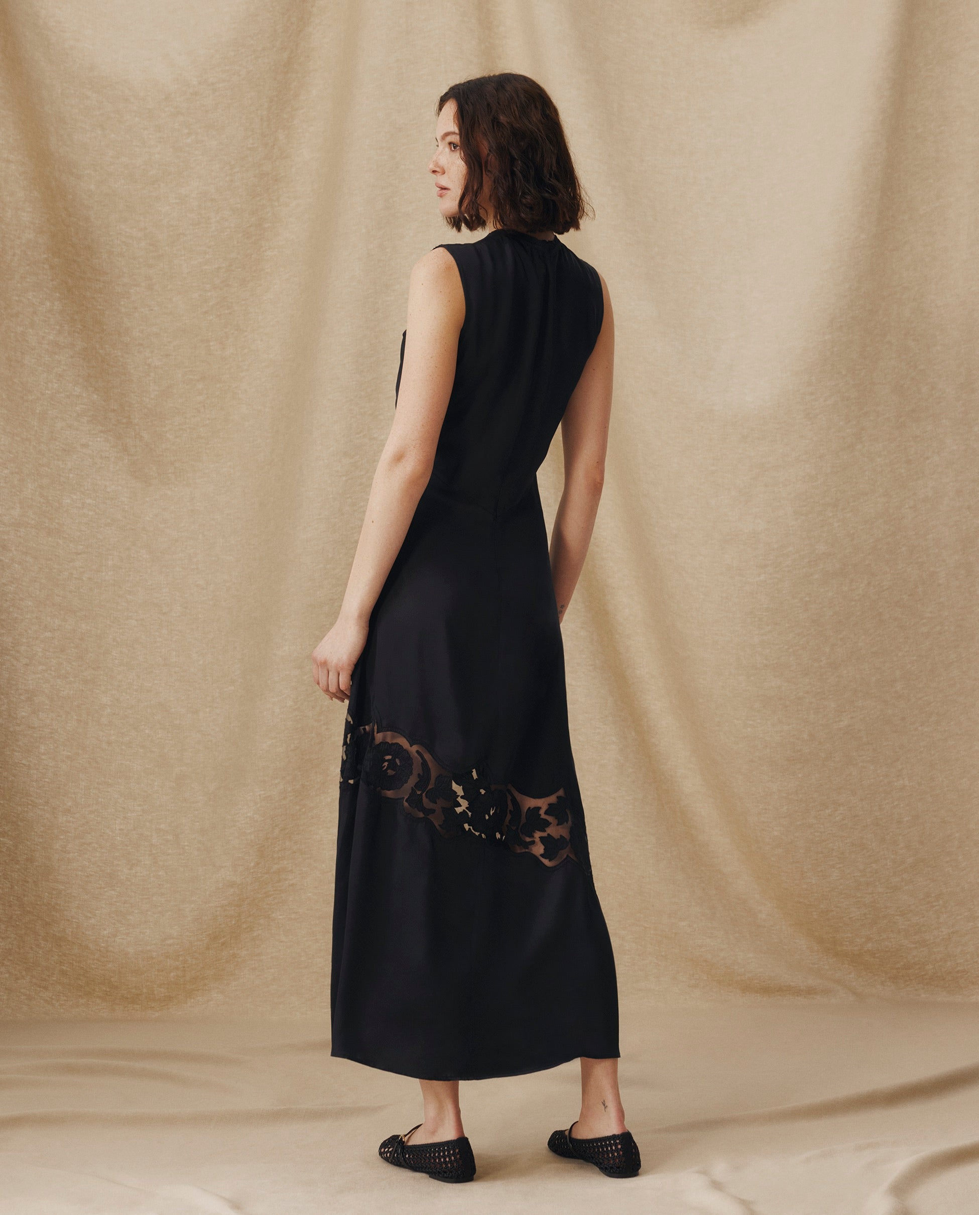 El vestido Pampita combina un sutil dramatismo con una elegancia atemporal. Diseñado con una fluida silueta larga, presenta intrincados bordados florales en el corpiño y la falda para un impactante contraste de texturas. Con escote redondo, corte sin mangas y cremallera oculta en la espalda, es una opción refinada tanto para el día como para la noche.