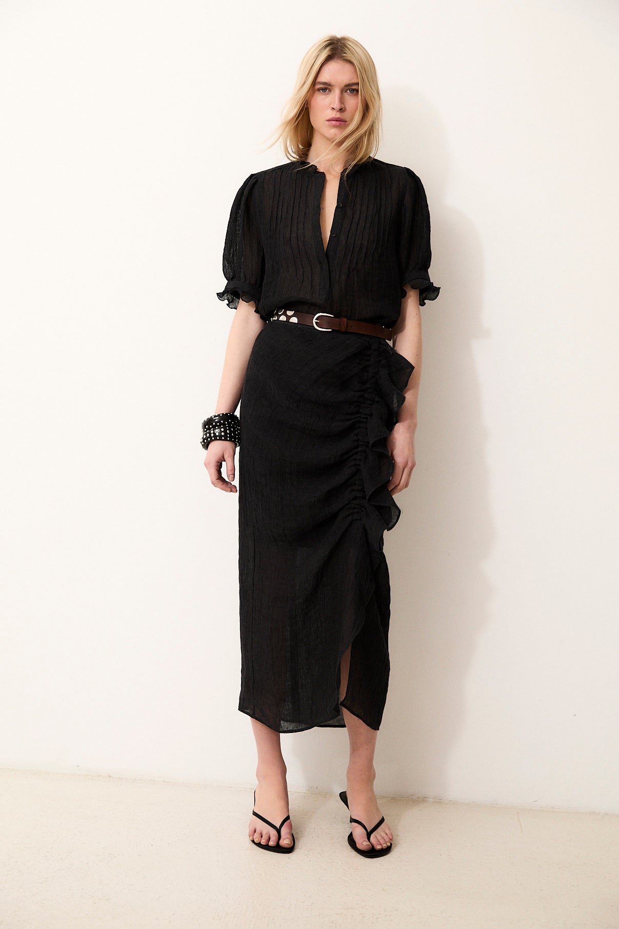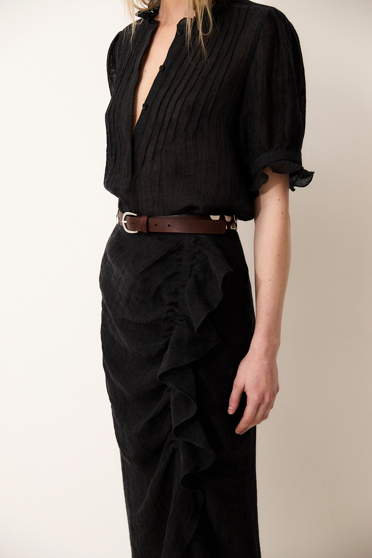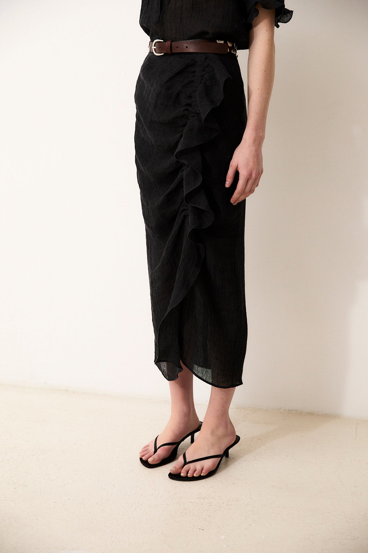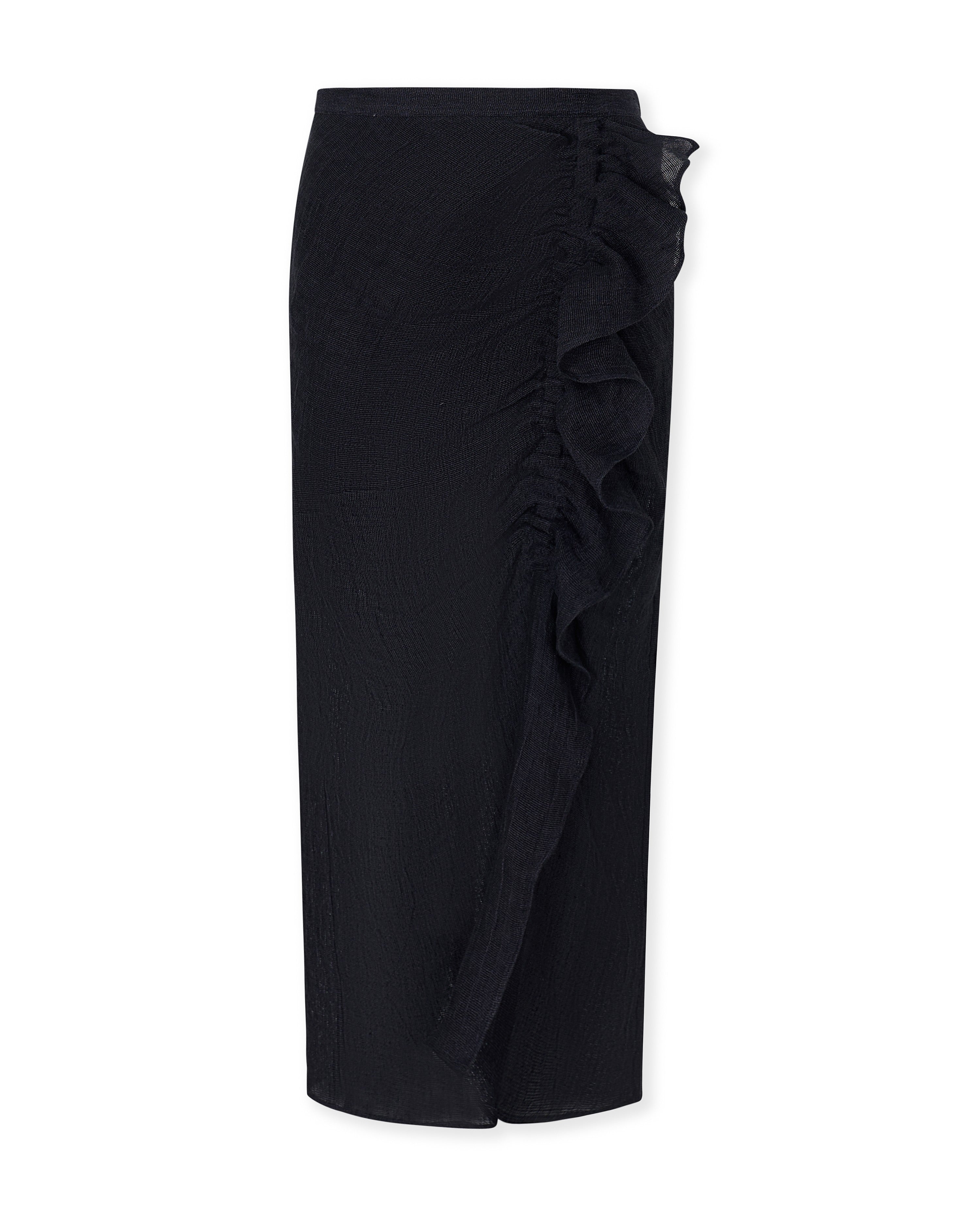 The Black Catalina skirt blends elegance and lightness in a feminine, refined silhouette. Crafted from 100% Italian linen, it stands out for its natural texture and fluid drape. The design is enhanced by a delicate front ruffle detail that adds movement and character to the piece. Perfectly paired with the matching Catalina blouse for a polished and contemporary set.