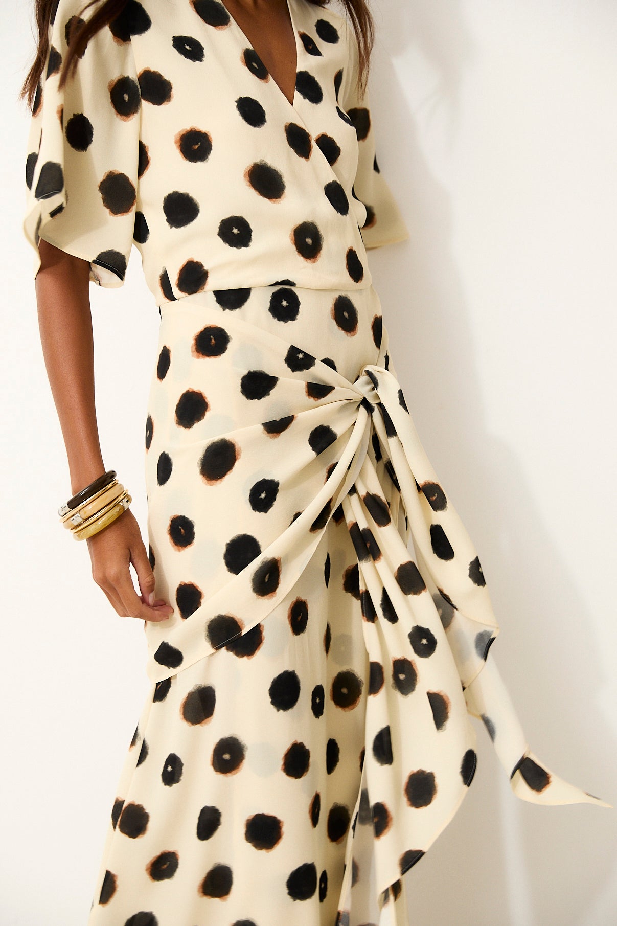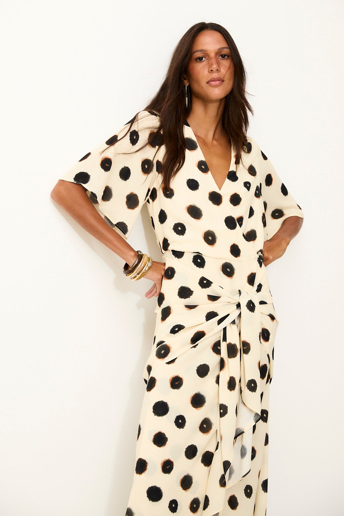 Effortless and feminine, the Dotty dress is crafted in an artisanal ink spot print on an ecru base with a fluid drape and soft movement. Designed with a deep V neckline and relaxed short sleeves, it fastens with a discreet button at the front before falling into a wrap-style silhouette. The long tie can be worn knotted at the waist for a defined shape, or left loose to create cascading ruffles down the sides for a softer, more fluid finish.