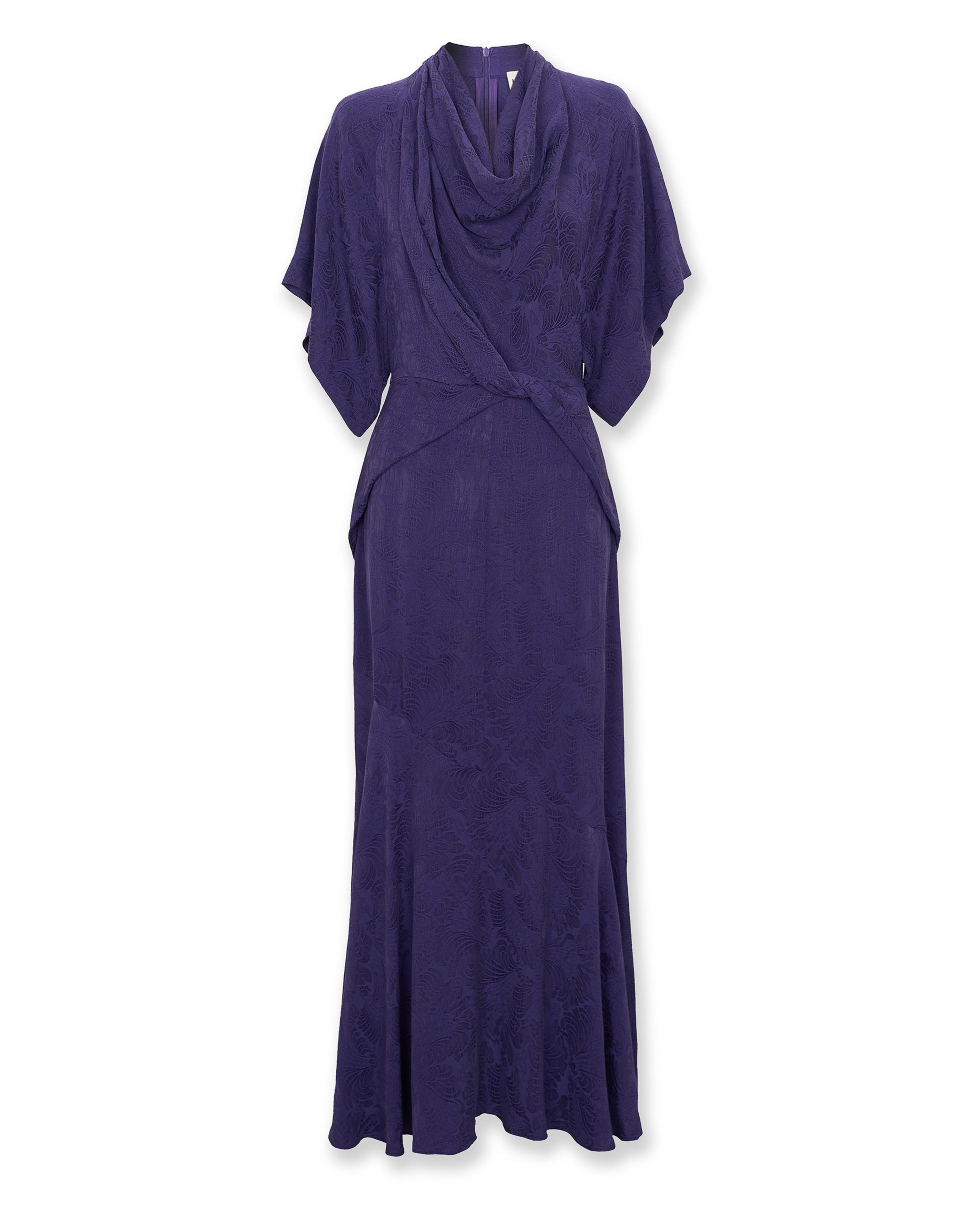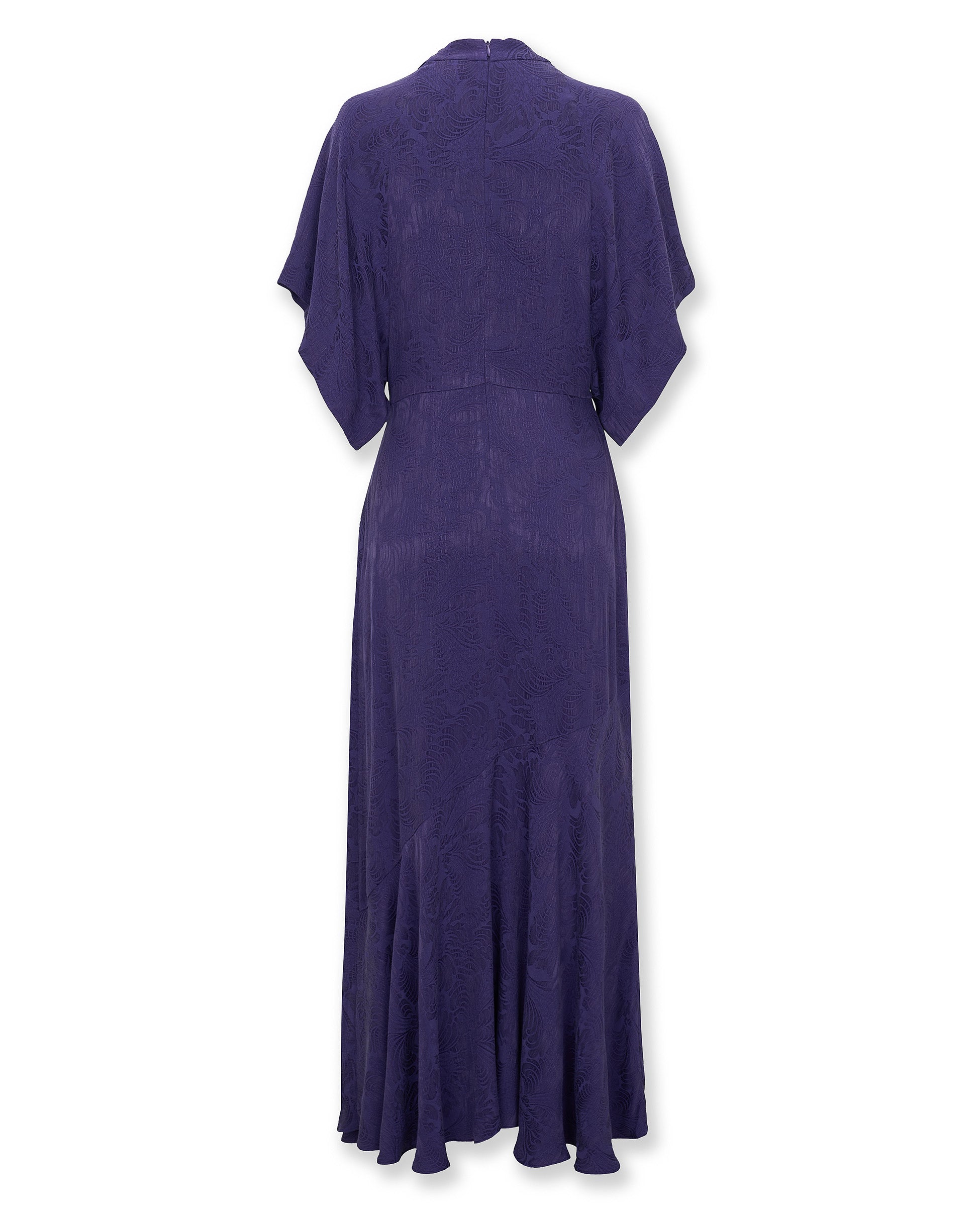 Cut in a dark purple cupro blend jacquard with a soft tonal pattern, the Flaviana dress moves with effortless elegance. Designed with a draped cowl neckline and relaxed kimono sleeves, it is shaped through the waist with a wrap effect detail that flatters the silhouette. Falling to a fluid maxi length with a softly flared hem, it is finished with a concealed zip at the back for a clean fit.