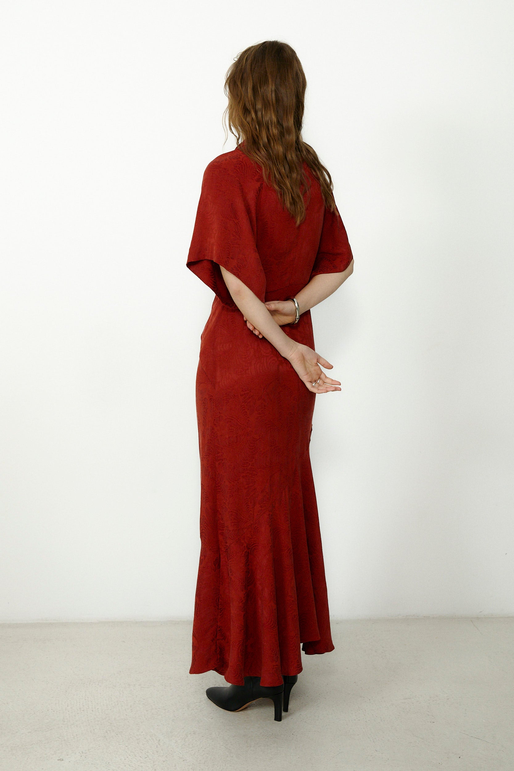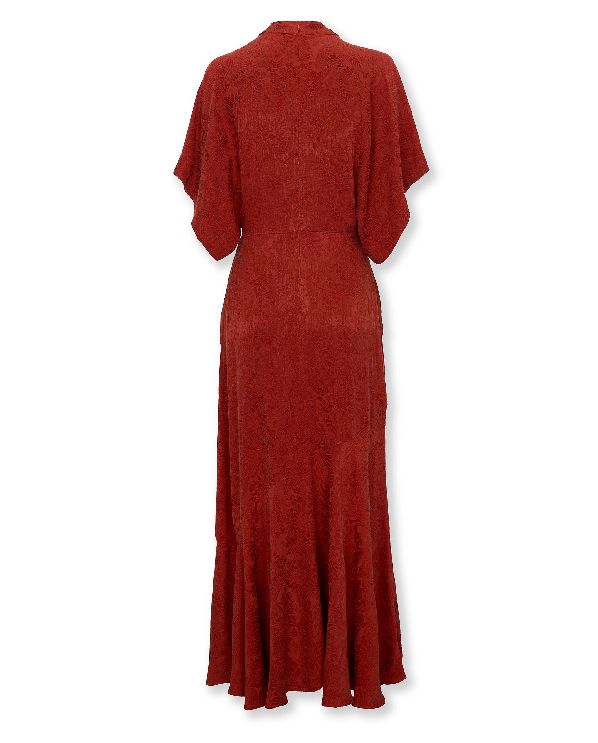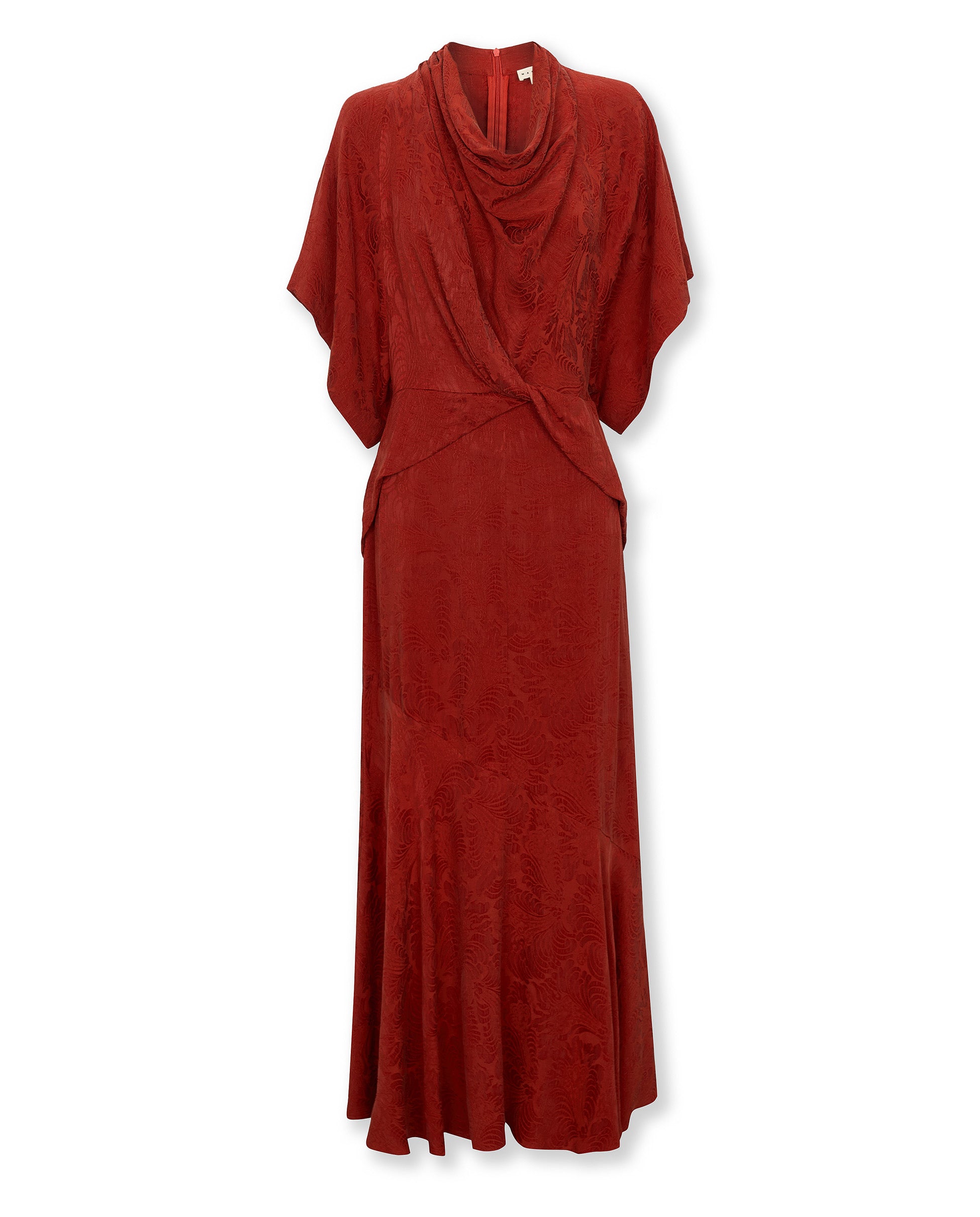 Cut in a rich rust-toned cupro blend jacquard with a soft tonal pattern, the Flaviana dress moves with effortless elegance. Designed with a draped cowl neckline and relaxed kimono sleeves, it is shaped through the waist with a wrap effect detail that flatters the silhouette. Falling to a fluid maxi length with a softly flared hem, it is finished with a concealed zip at the back for a clean fit.