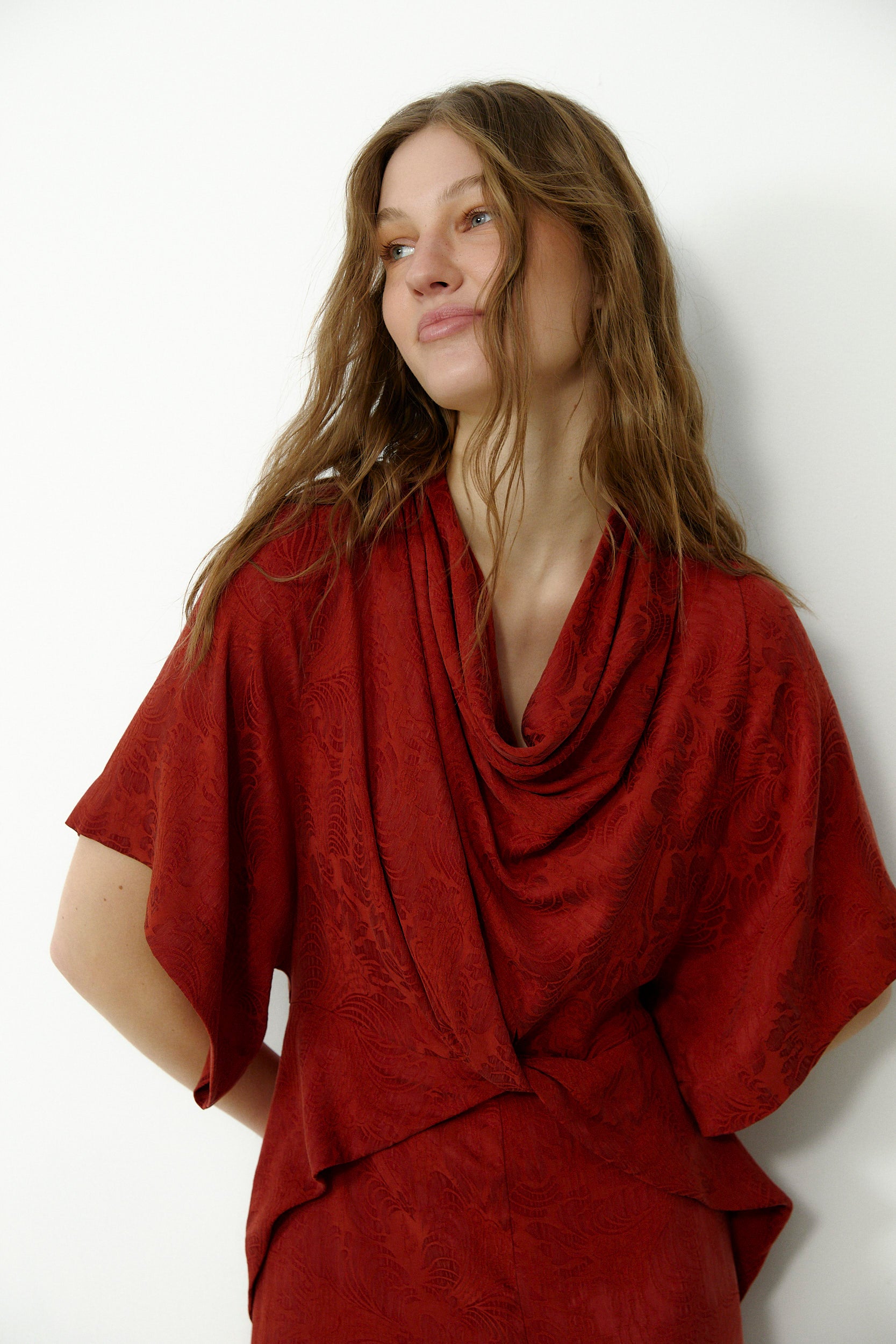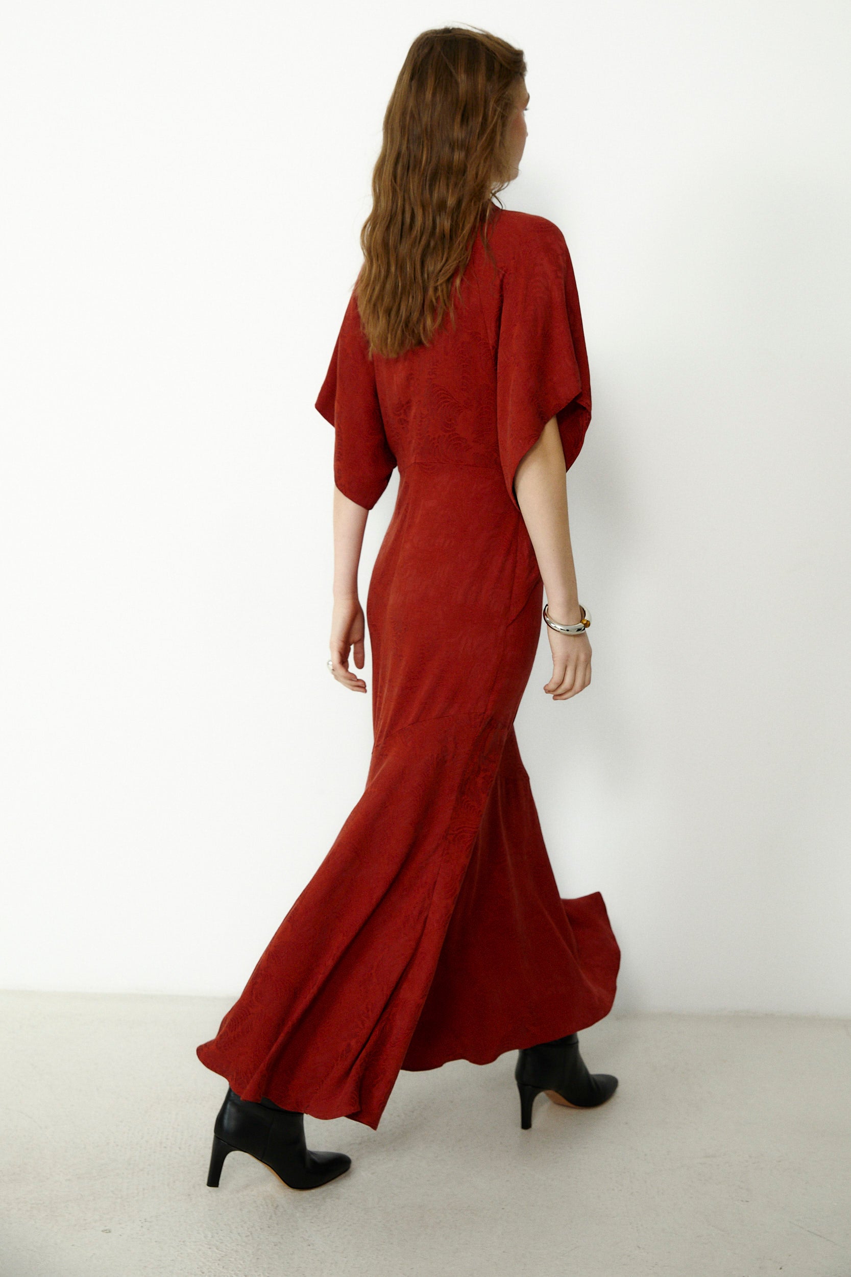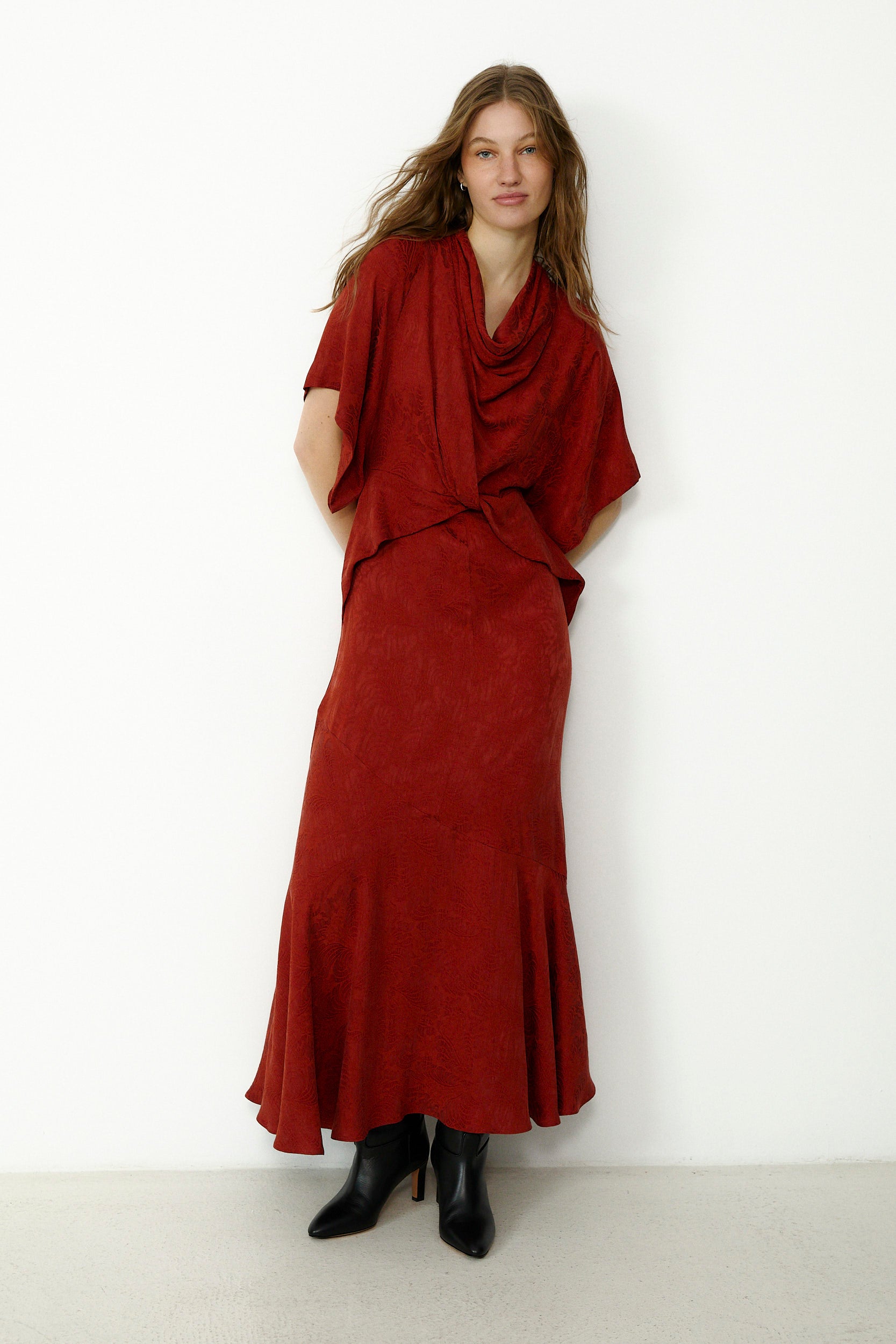 Cut in a rich rust-toned cupro blend jacquard with a soft tonal pattern, the Flaviana dress moves with effortless elegance. Designed with a draped cowl neckline and relaxed kimono sleeves, it is shaped through the waist with a wrap effect detail that flatters the silhouette. Falling to a fluid maxi length with a softly flared hem, it is finished with a concealed zip at the back for a clean fit.