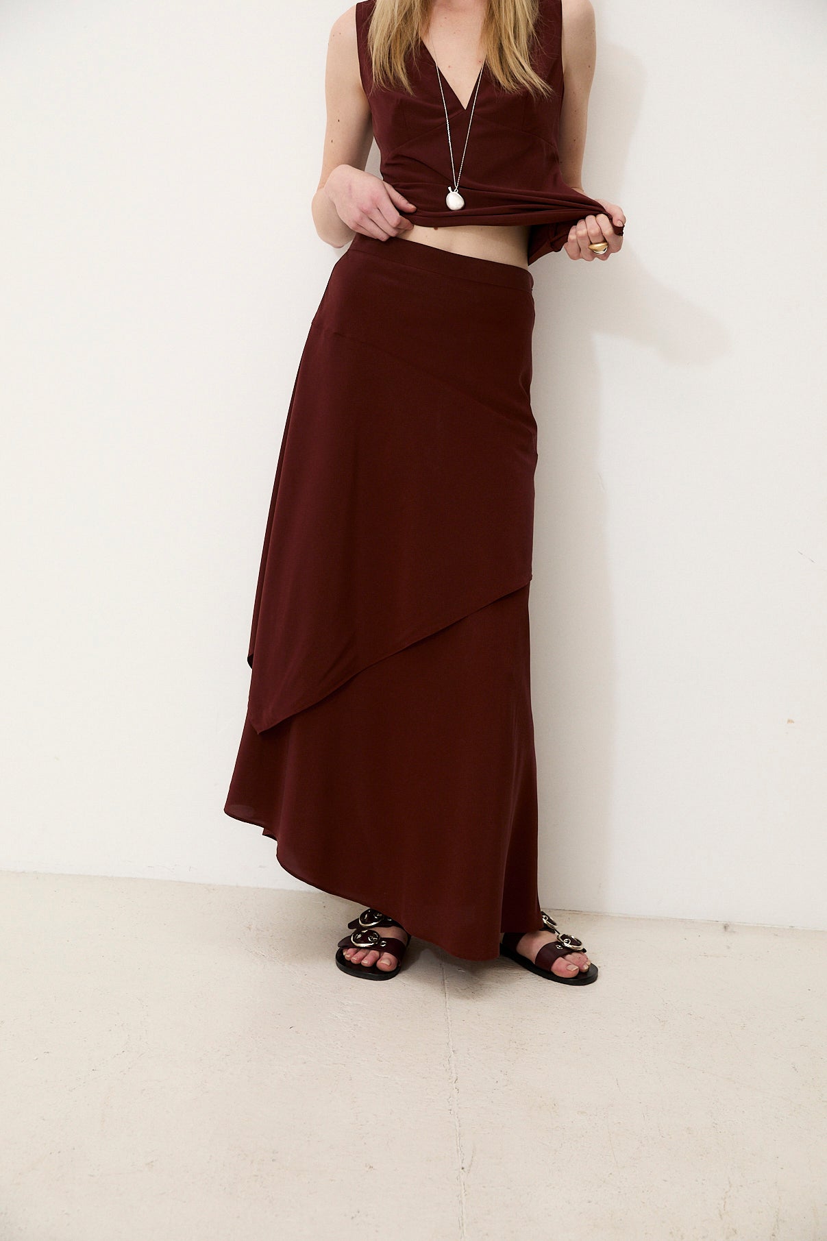 The Ginevra skirt stands out for its timeless elegance and graceful movement. Crafted from natural silk, it features a fluid silhouette with layered panels that create a refined asymmetric effect. Its soft drape adds beautiful movement with every step, making it a versatile and sophisticated piece. Pair it with the matching Ginevra top for a coordinated, elevated look.