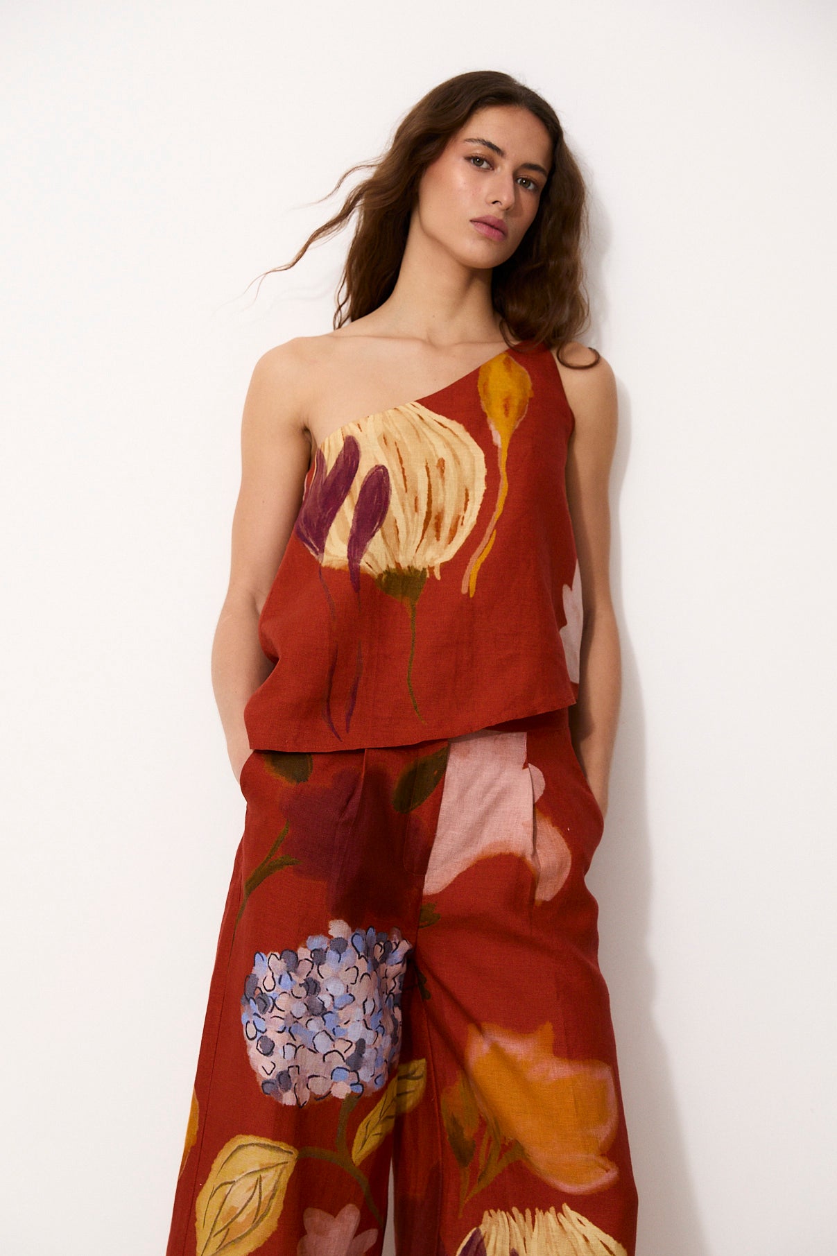 The Juna top is a special piece that blends contemporary design with textile tradition. Crafted from 100% linen, it stands out for its lightness, breathability, and natural drape. Its artistic print, rich in nuance and character, makes every look unique.