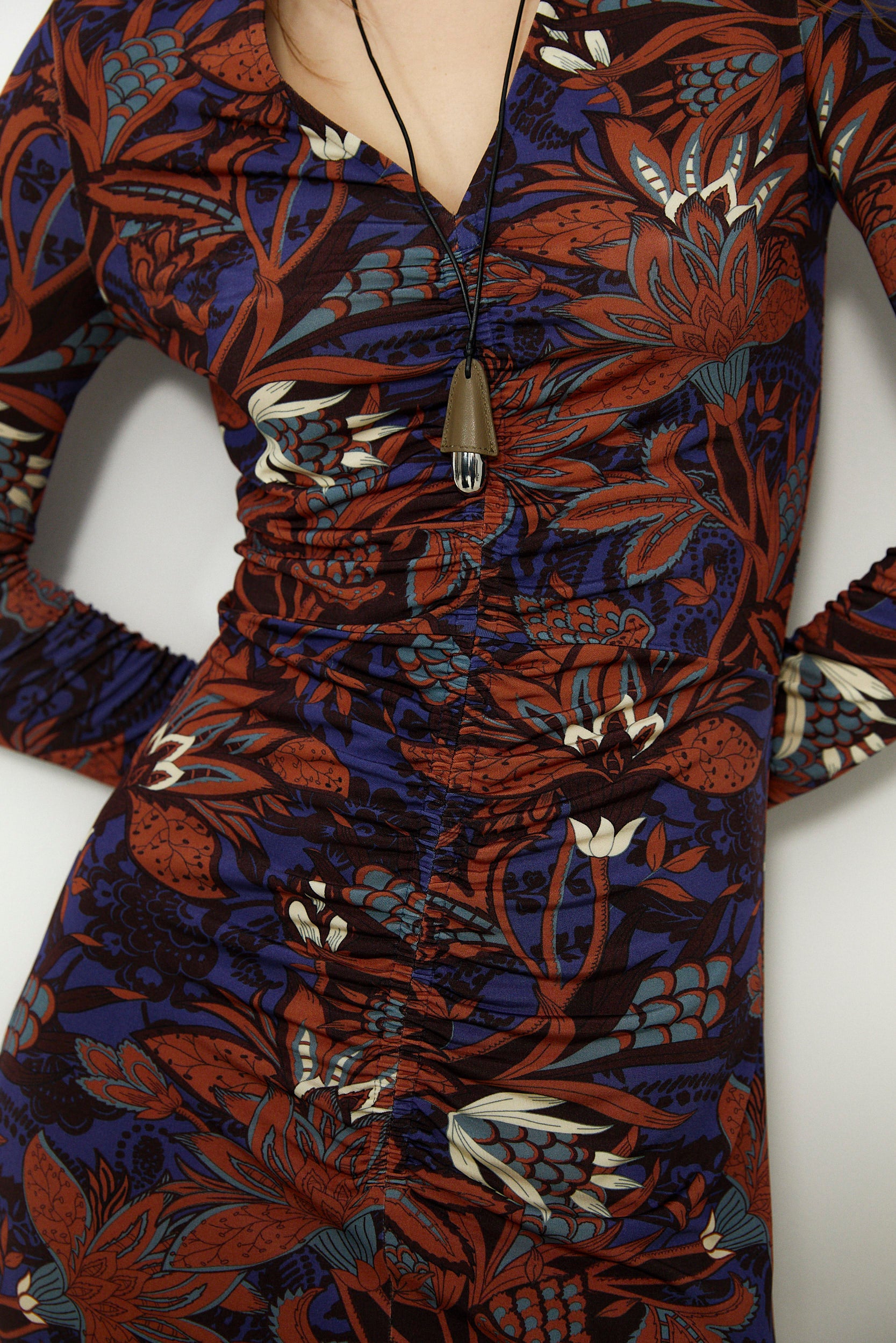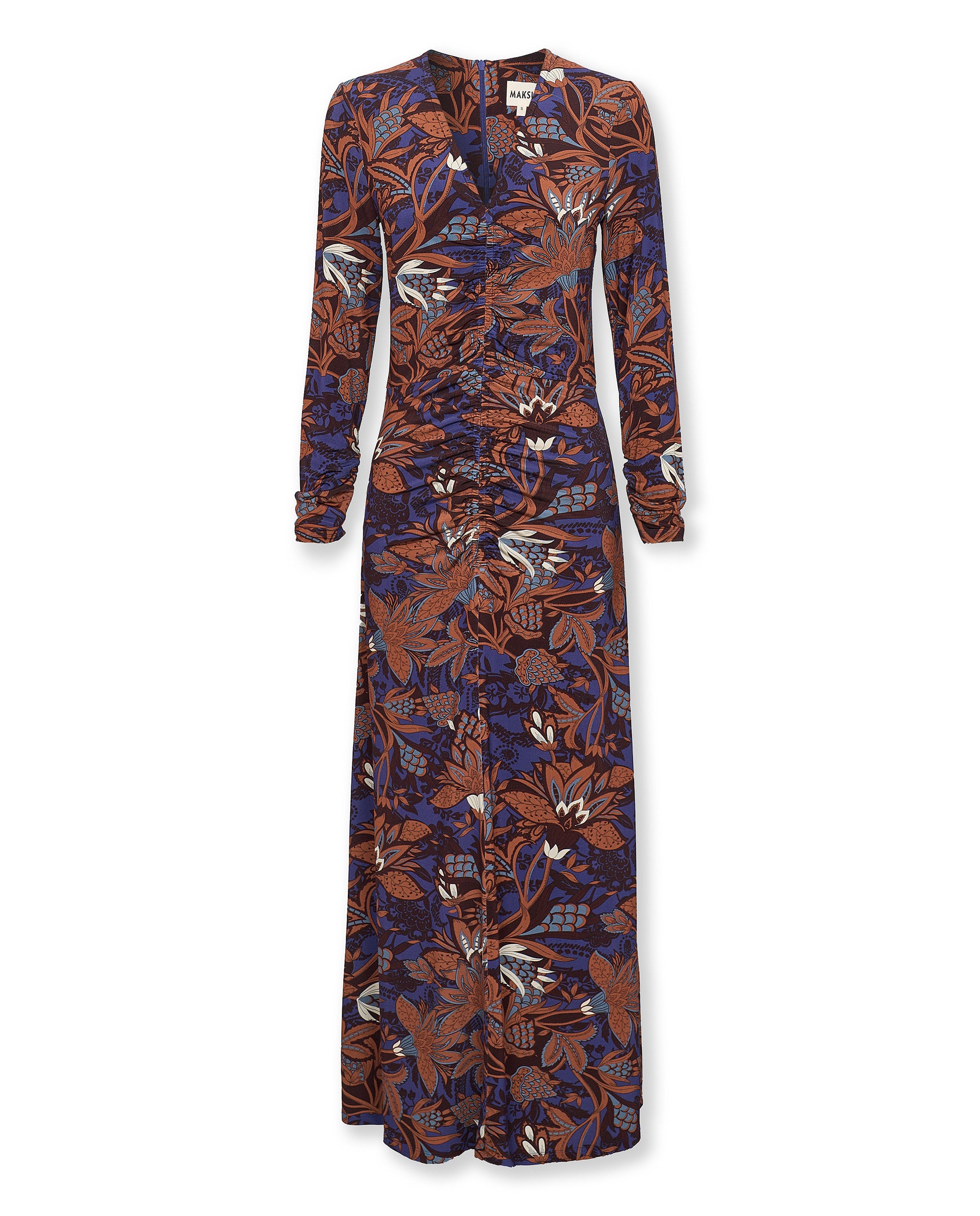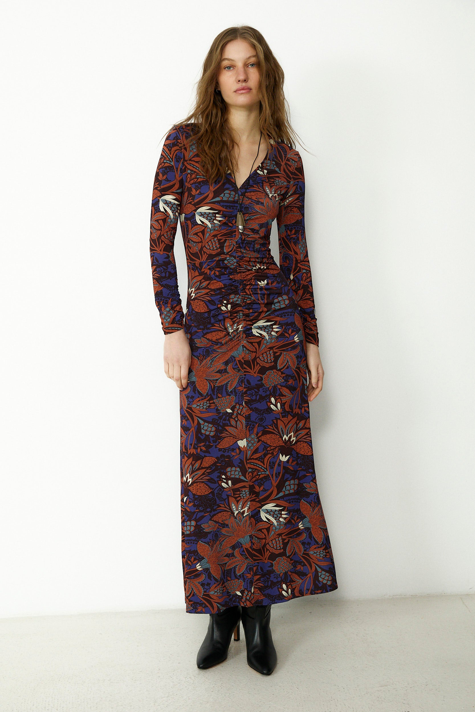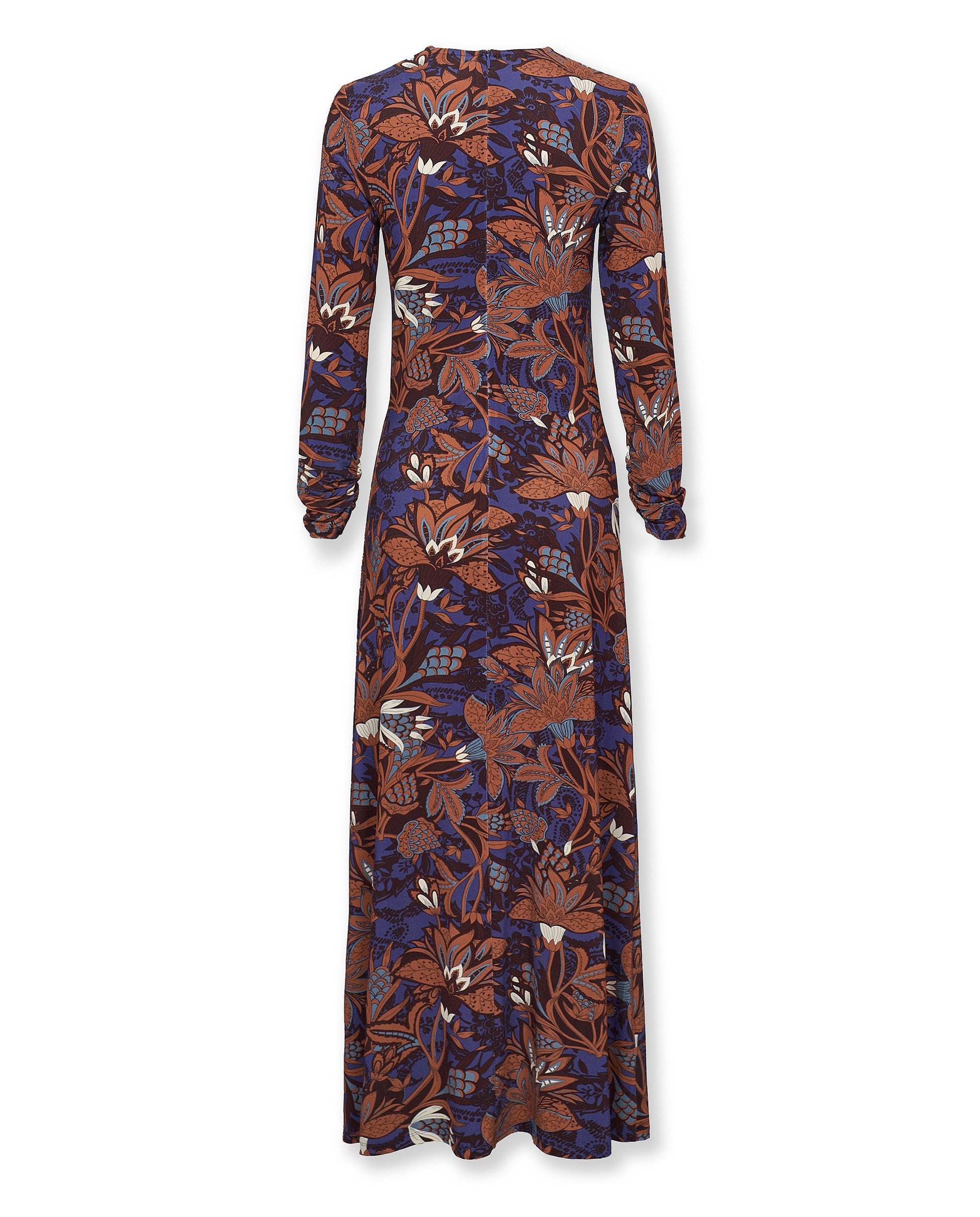 The Lucy midi dress brings a refined statement to everyday dressing with its rich brown floral print set against a deep tonal base. Designed with long sleeves and a flattering V neckline, it features gentle ruching through the bodice for a softly contoured fit. Finished with a fluid midi skirt for elegant movement, it is an exclusive design produced in limited quantities.