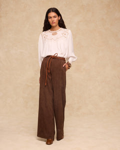 Timeless elegance meets relaxed structure in the Mocha blouse, crafted from 100% goat leather suede in a rich dark brown tone. Designed with a softly tailored silhouette, it features a classic shirt collar, tonal press-stud fastenings, and lightly gathered sleeves with elasticated cuffs. The supple suede drapes fluidly, adding understated sophistication to both day and evening styling. • 100% goat suede in a deep brown finish • Relaxed silhouette with elasticated cuffs and press-stud front • Softly structured with volume through the sleeve