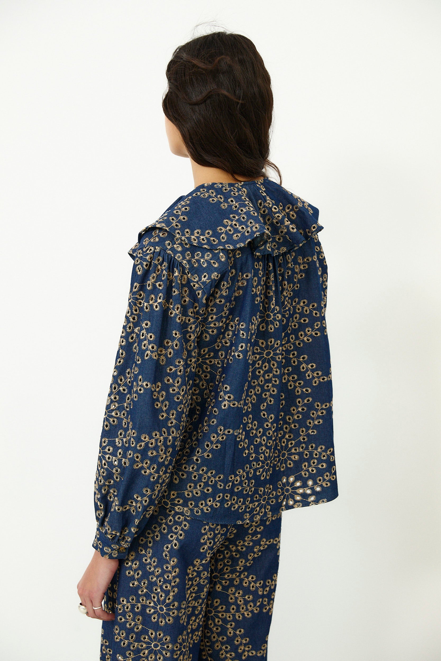 Crafted from 100% Italian cotton, the Skystitch blouse brings a romantic feel to everyday dressing with intricate all over embroidery in soft contrast tones. Designed with a statement ruffle collar and long blouson sleeves, it is finished with a neat button front and gentle gathers for an easy, flattering shape. Pair with the matching trousers for effortless coordination.
