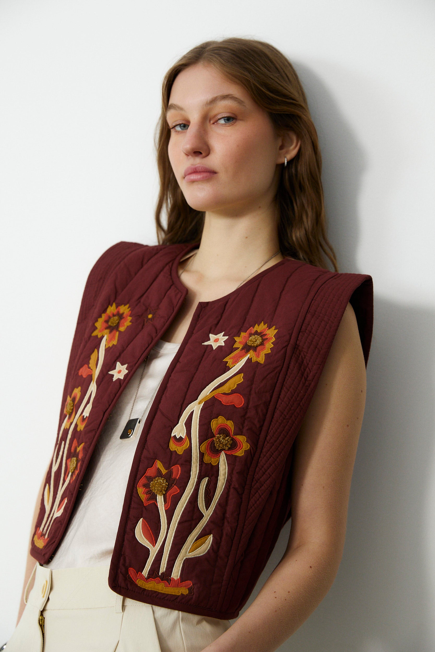 Crafted from 100% cotton, the Vega vest is a statement layer with an artisanal finish. Machine quilted for soft structure, it is detailed with hand guided embroidery appliqué at the front, creating a bold floral motif in warm, contrasting tones. Wear it over simple knits and shirts to add colour, texture and craftsmanship to everyday looks.