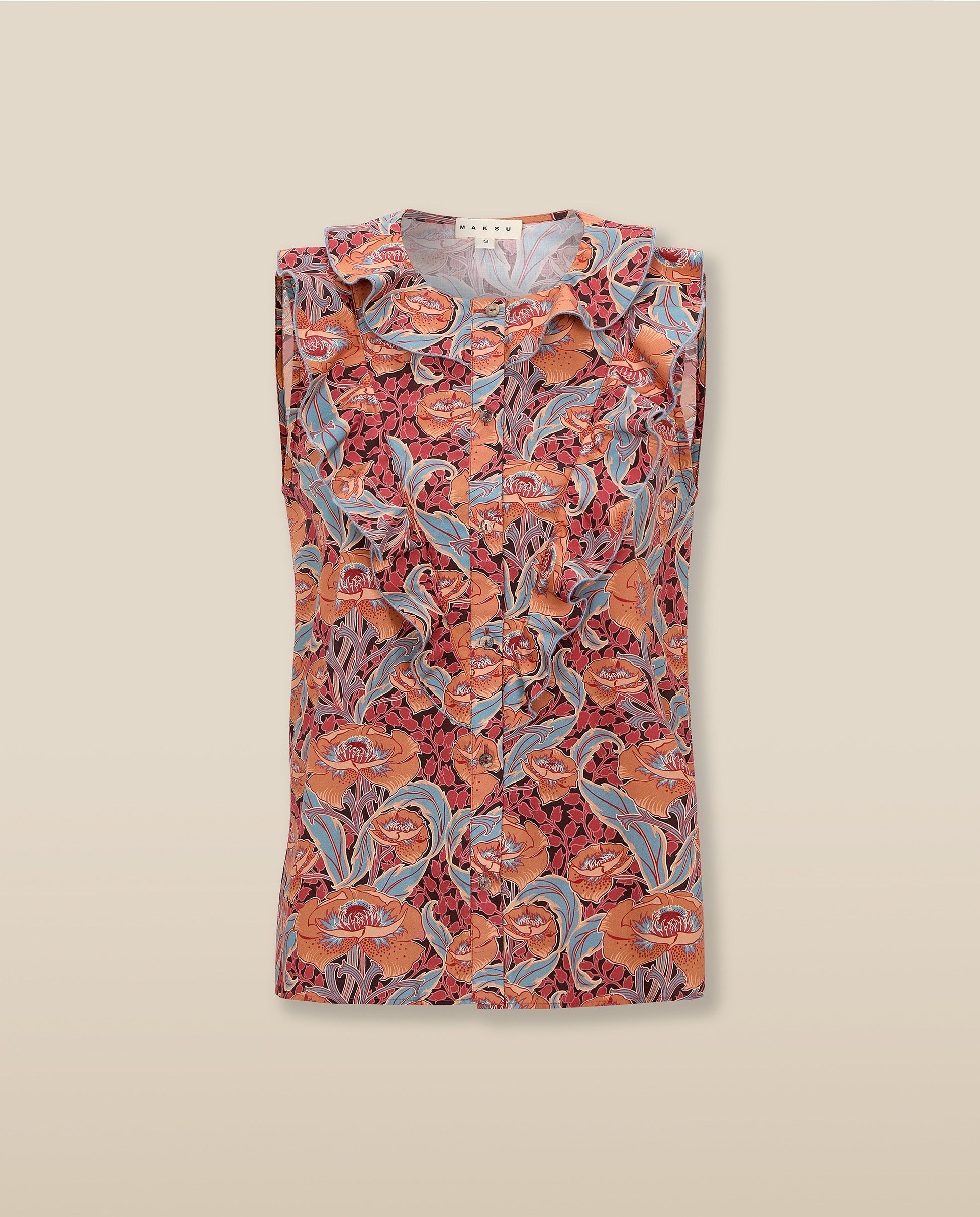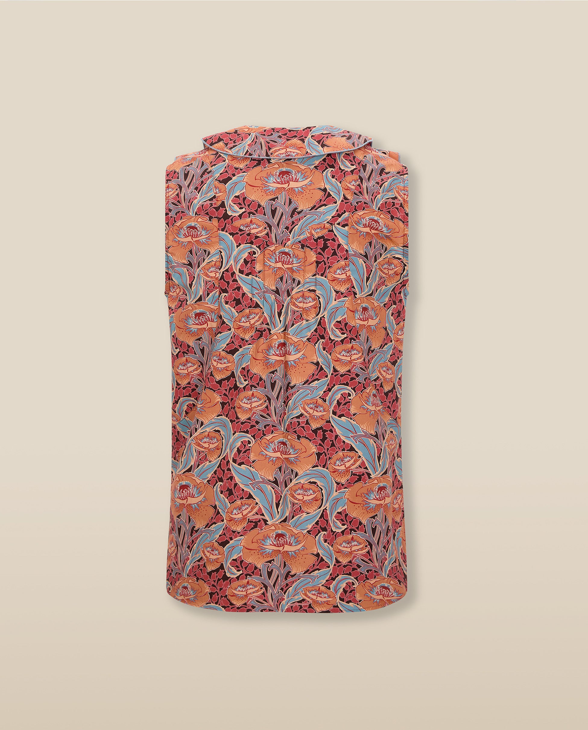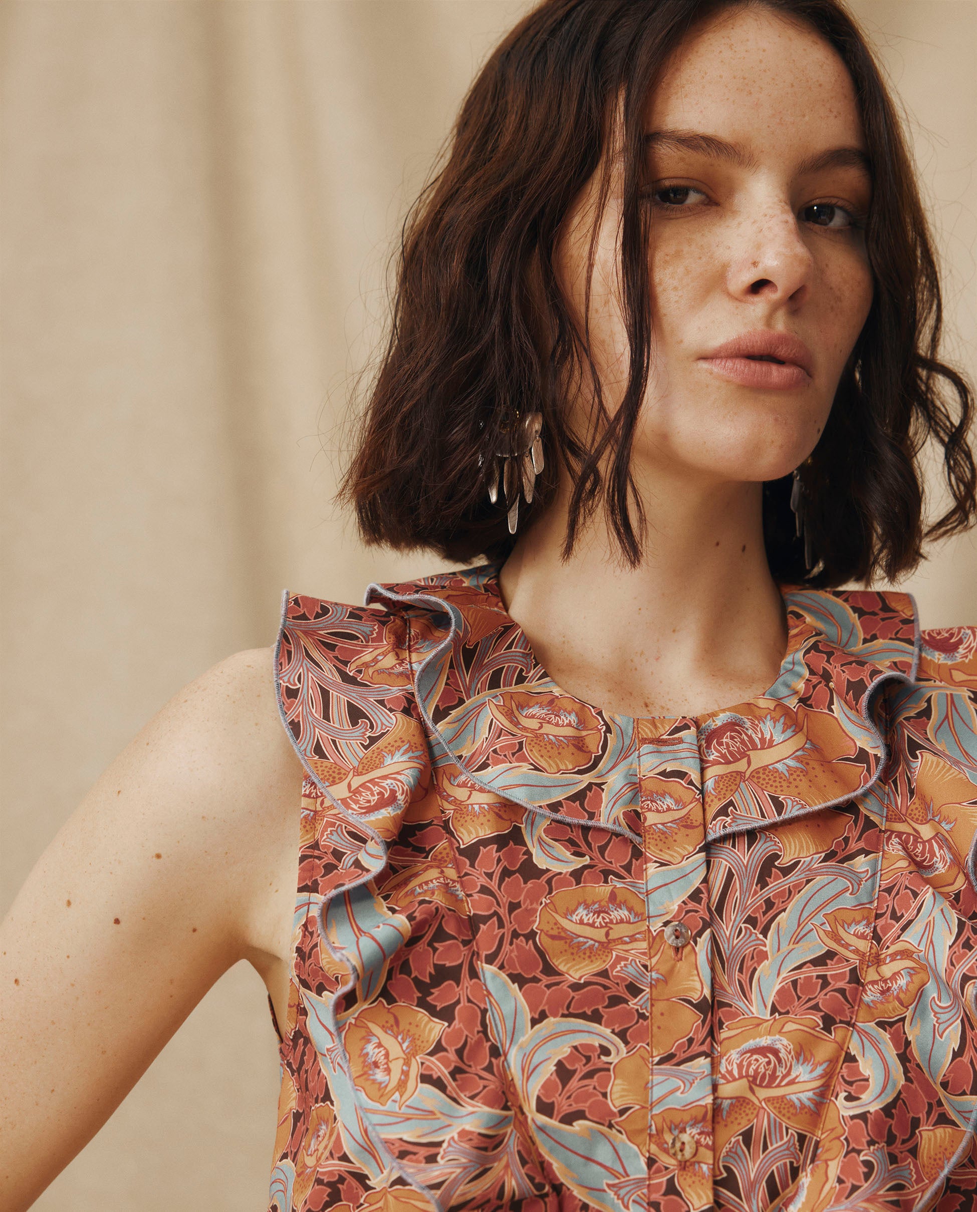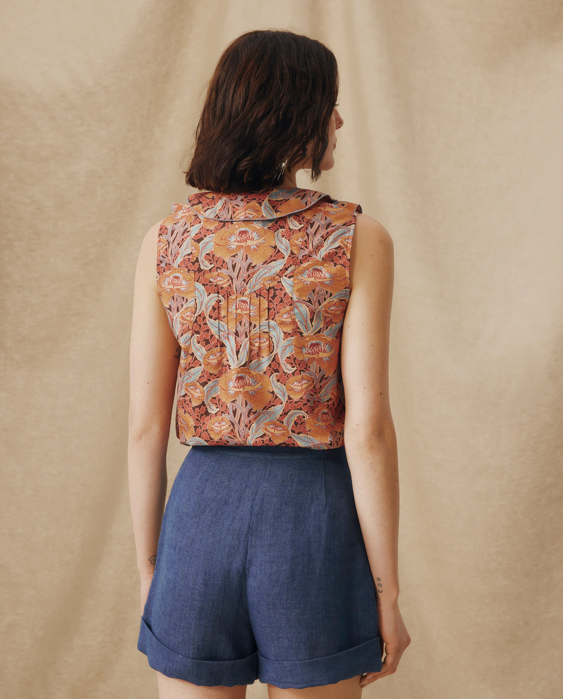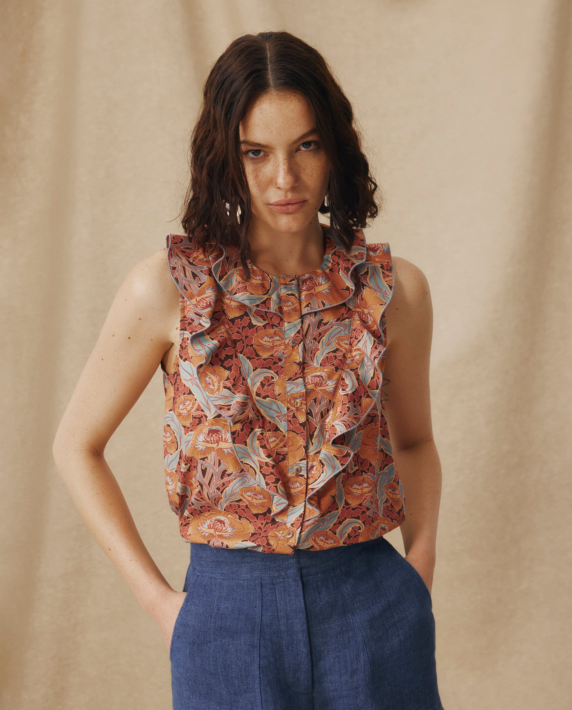 Simgesel Liberty kumaşından üretilen Irama Bluz, terakota, tozlu gül ve açık mavi renklerindeki resimsi çiçek baskısıyla tanımlanıyor. Fırfırlı yaka ve düğmeli ön kısım romantik bir çekicilik katarken, kolsuz kesimi onu zahmetsizce çok yönlü hale getiriyor; terzilik işlerine sokulması veya sıcak günlerde bol giyilmesi ideal.