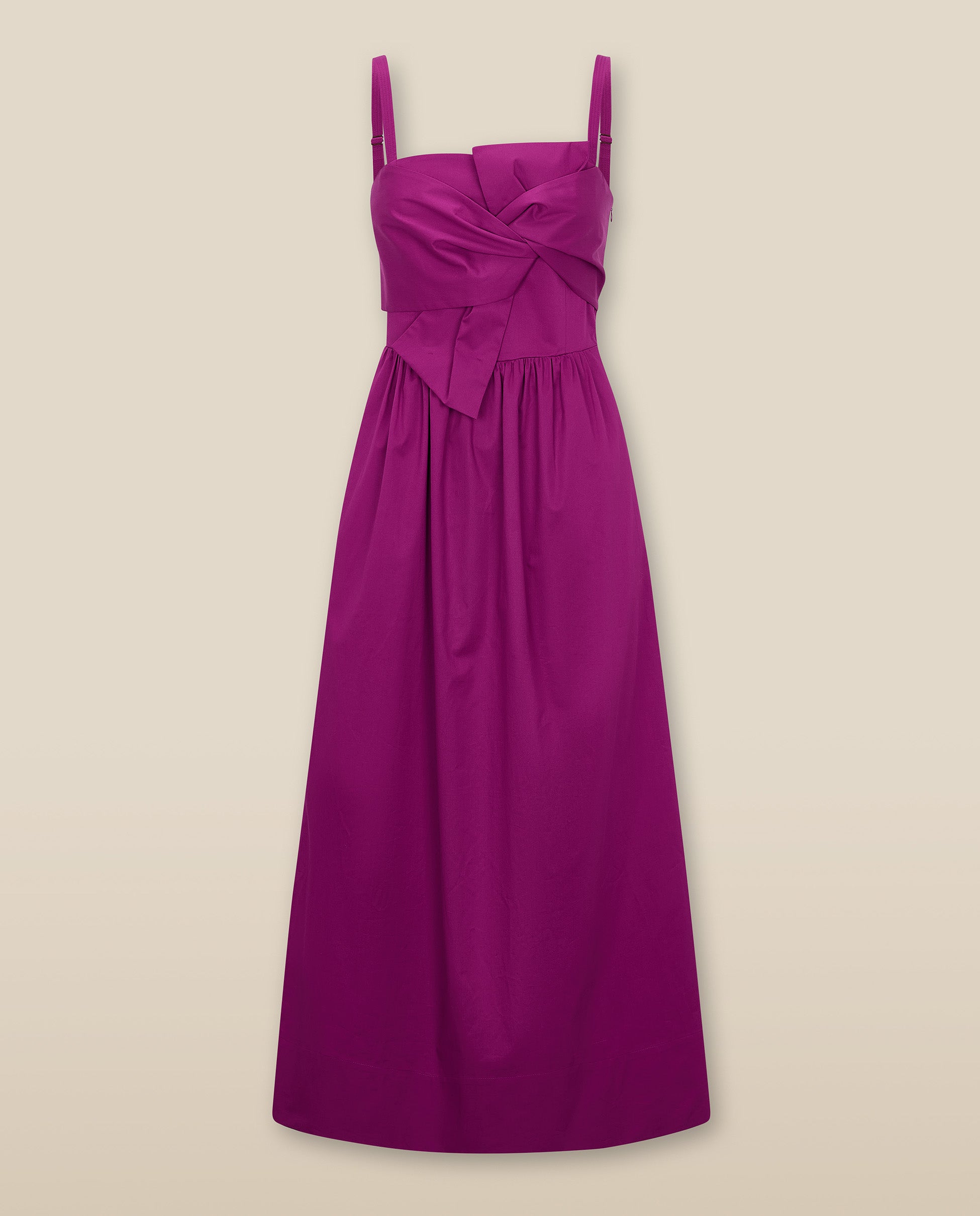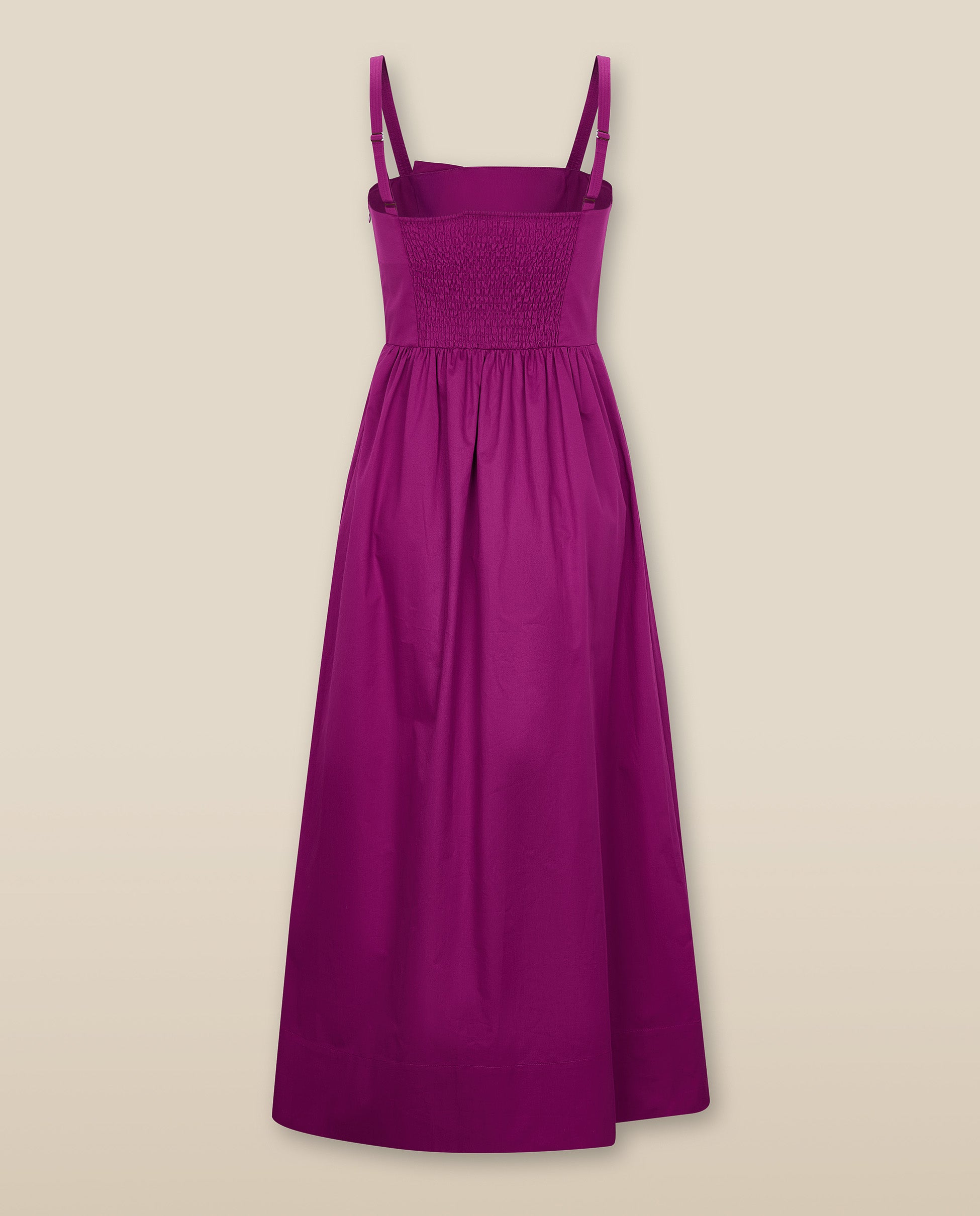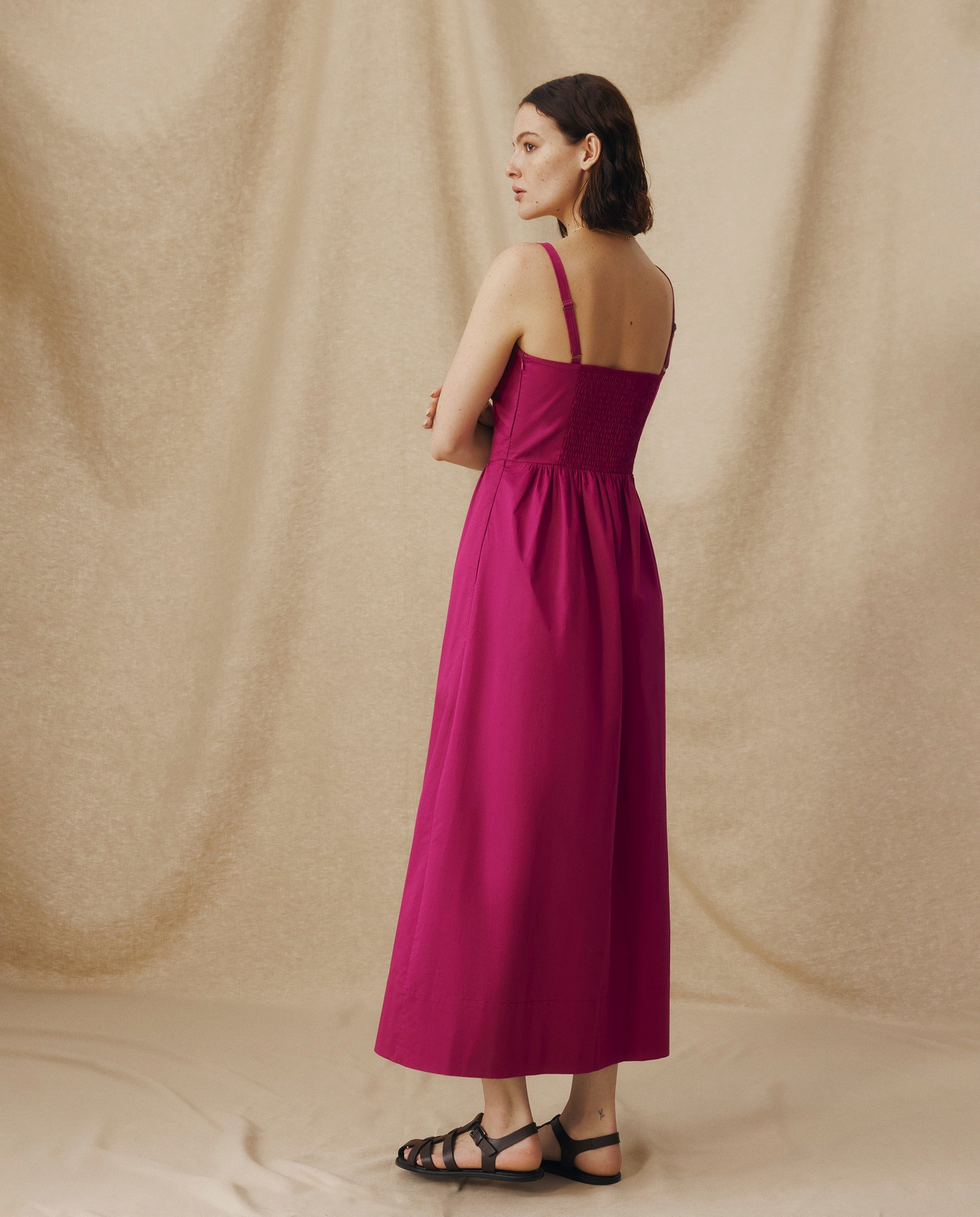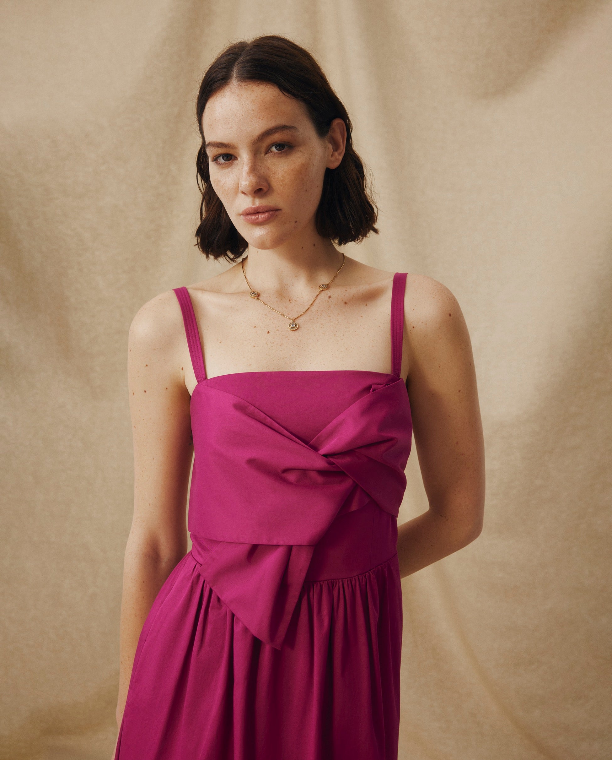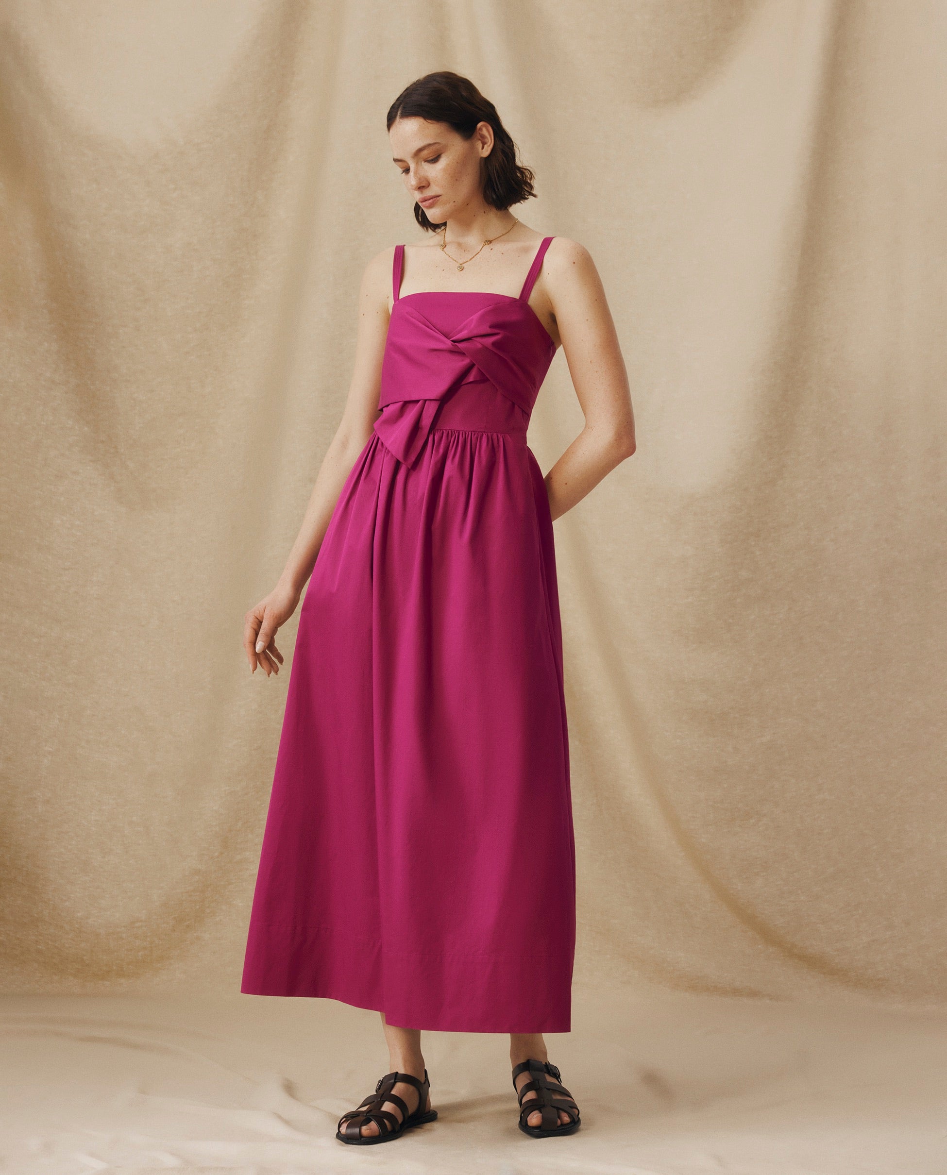 Özel gün giyimine rafine bir yaklaşım olan fuşya pembesi Lucila Elbise, yapılandırılmış bir silüet ve zarif bir rahatlıkla canlı pamuklu poplinden üretilmiştir. Geniş askılar ve yumuşak bir şekilde şekillendirilmiş bir yaka ile çerçevelenmiş, daha fazla konfor ve esneklik için gösterişli bir ön bağ ve fırfırlı arka panele sahiptir. Yan fermuar ve sizinle birlikte hareket eden yumuşak bir şekilde toplanmış bir etekle tamamlanmıştır.