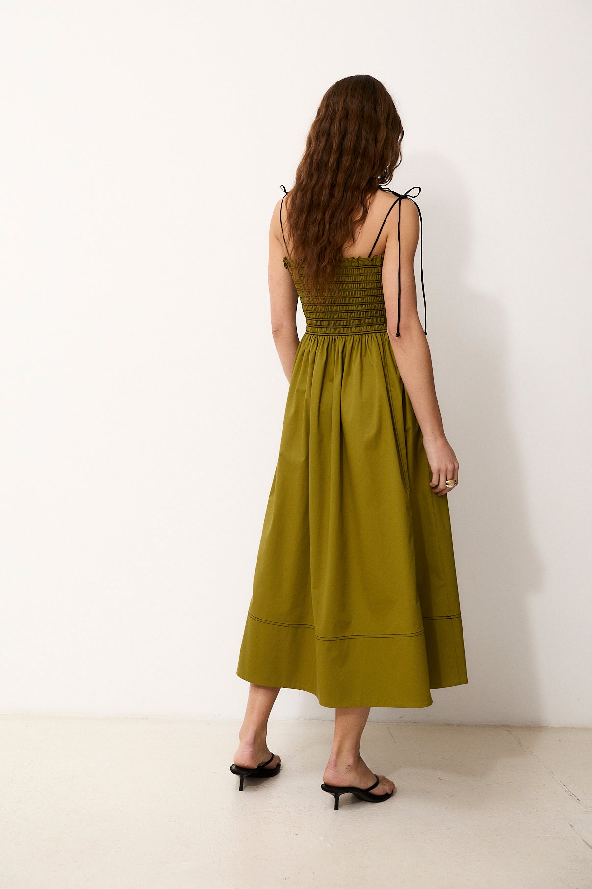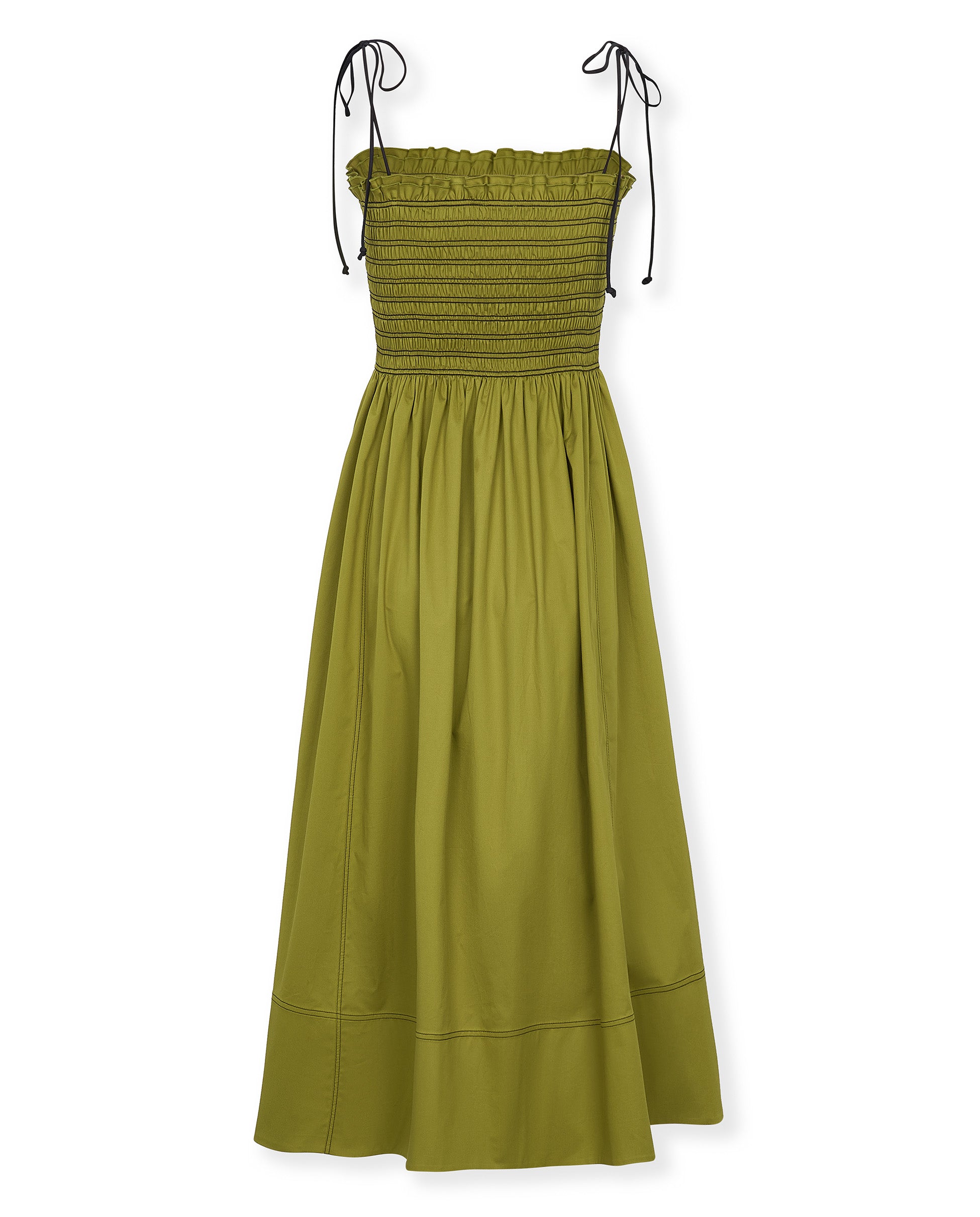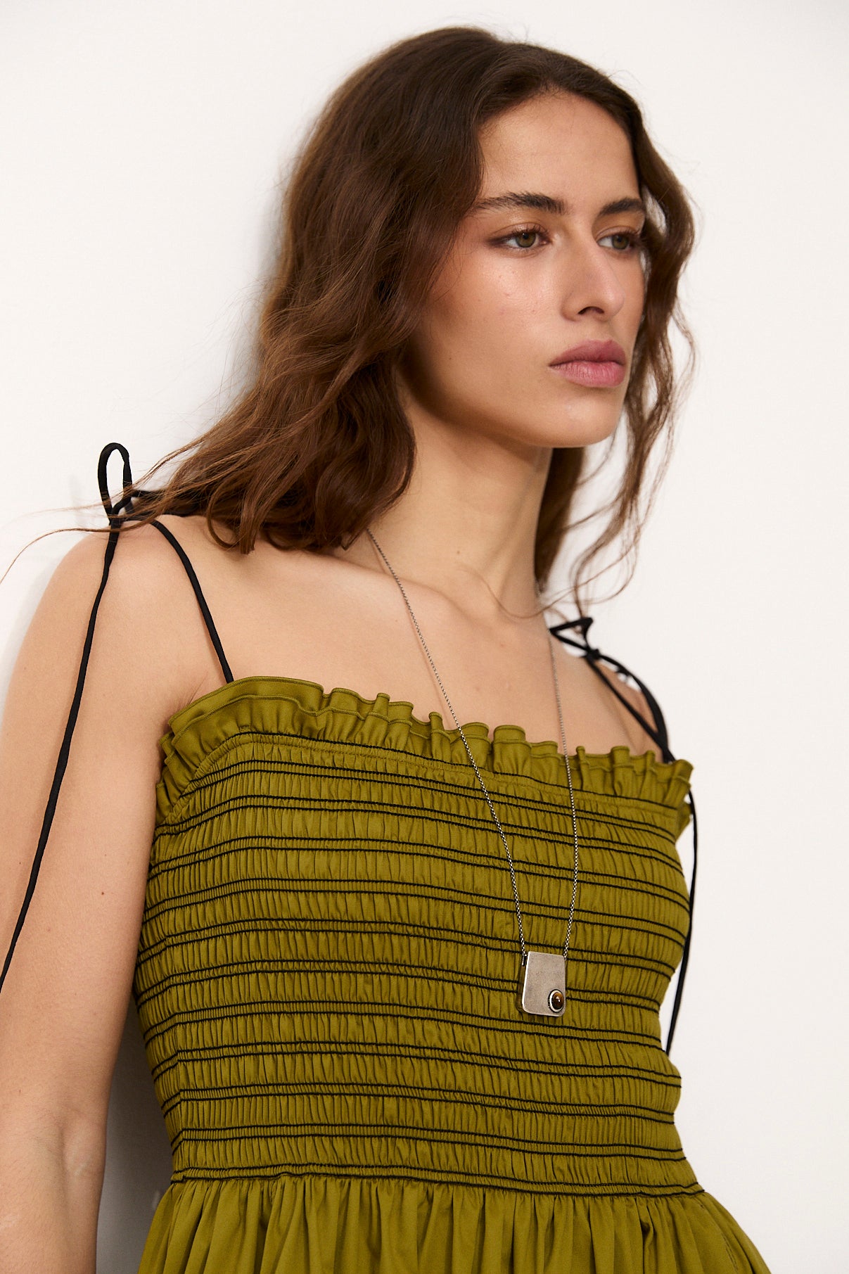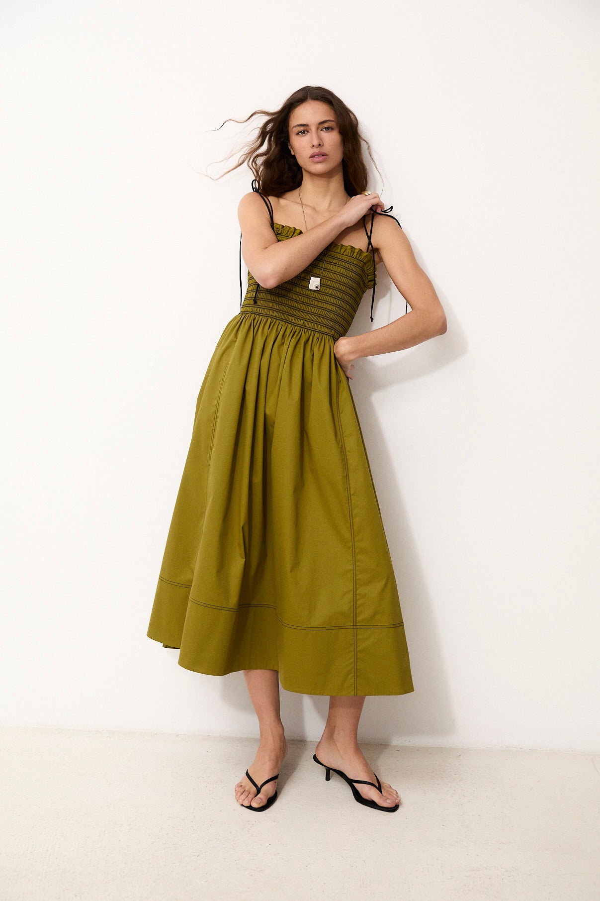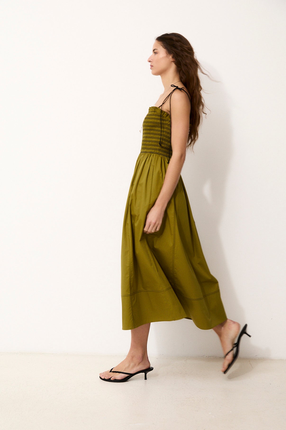 The Celin dress is crafted from cotton, combining freshness and comfort with a feminine silhouette. Its smocked bodice gently adapts to the body, while the full skirt adds movement and lightness. Adjustable thin straps complete this versatile, summery design.