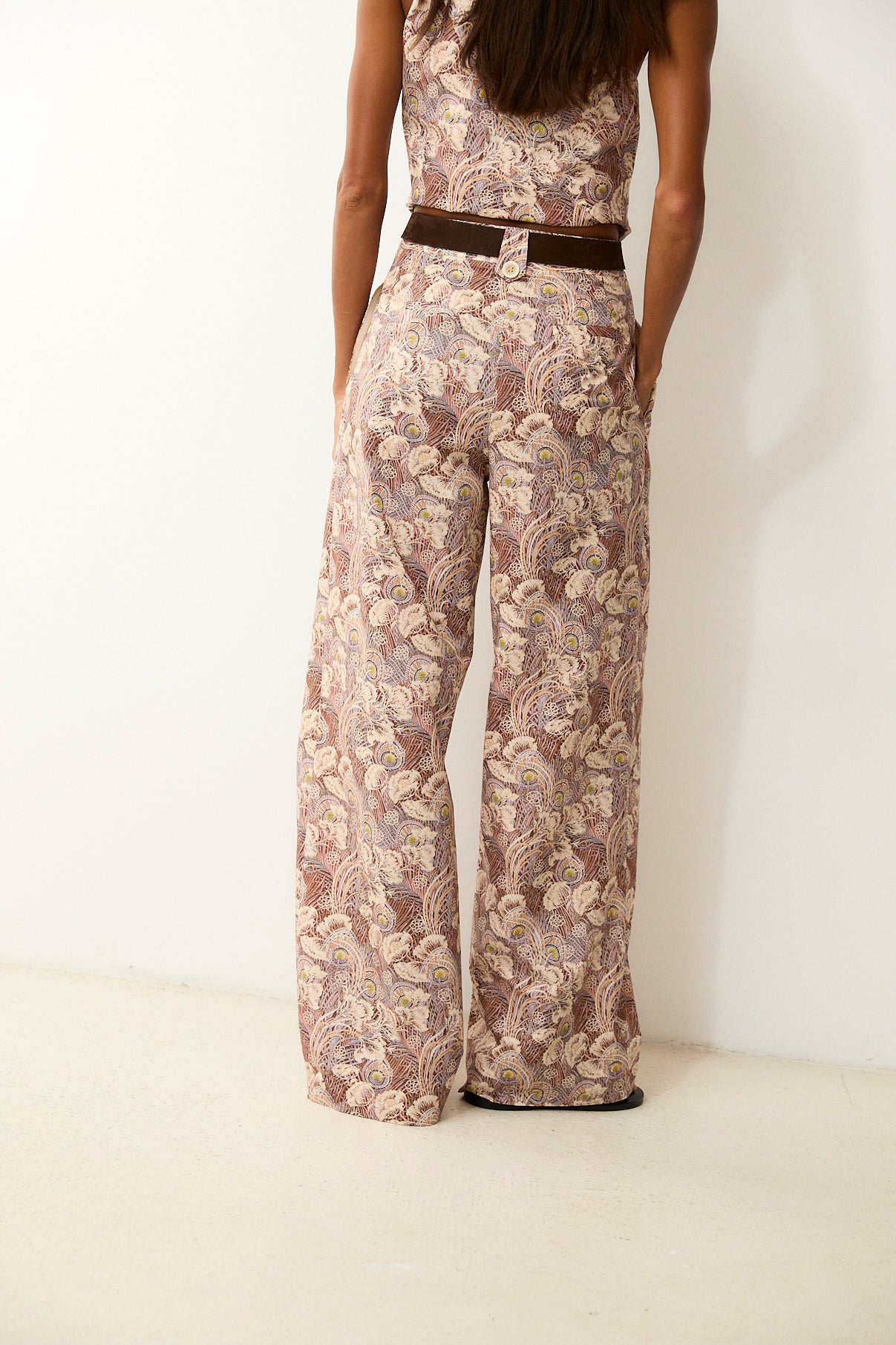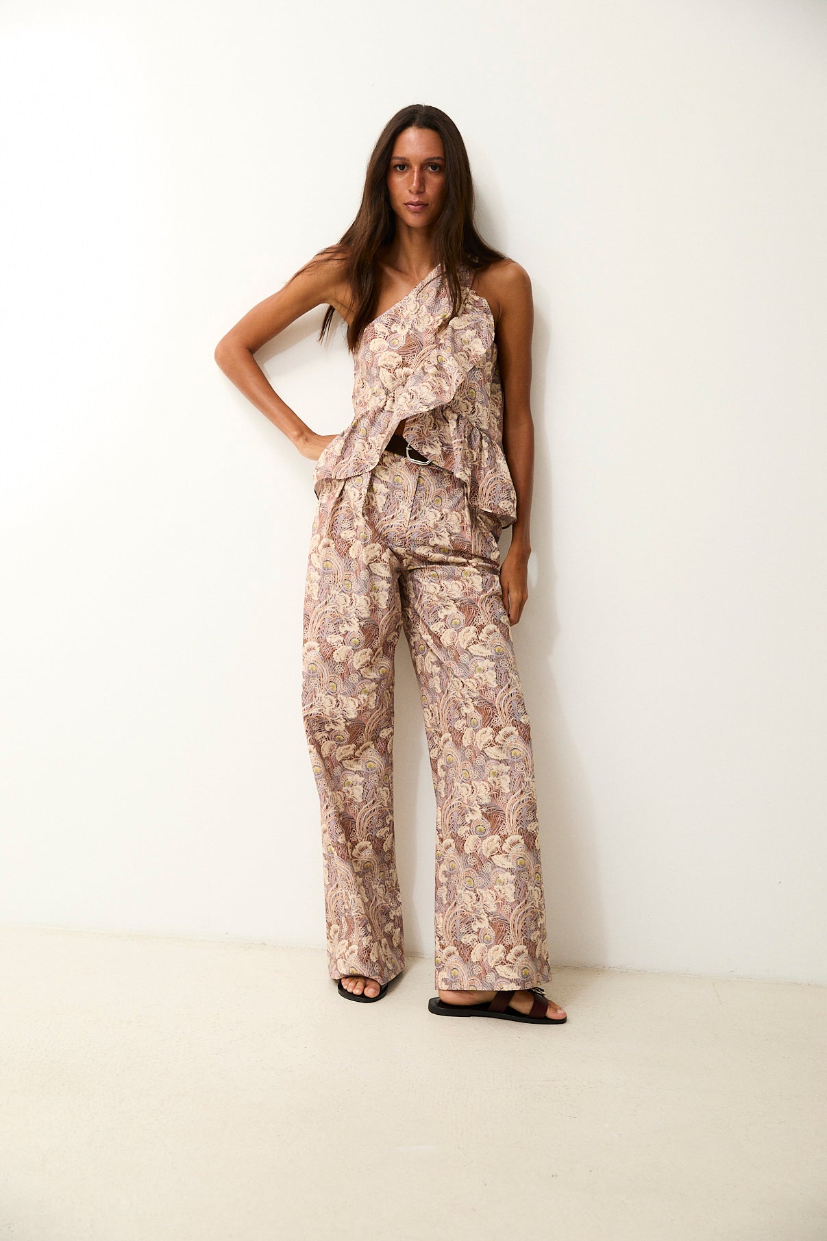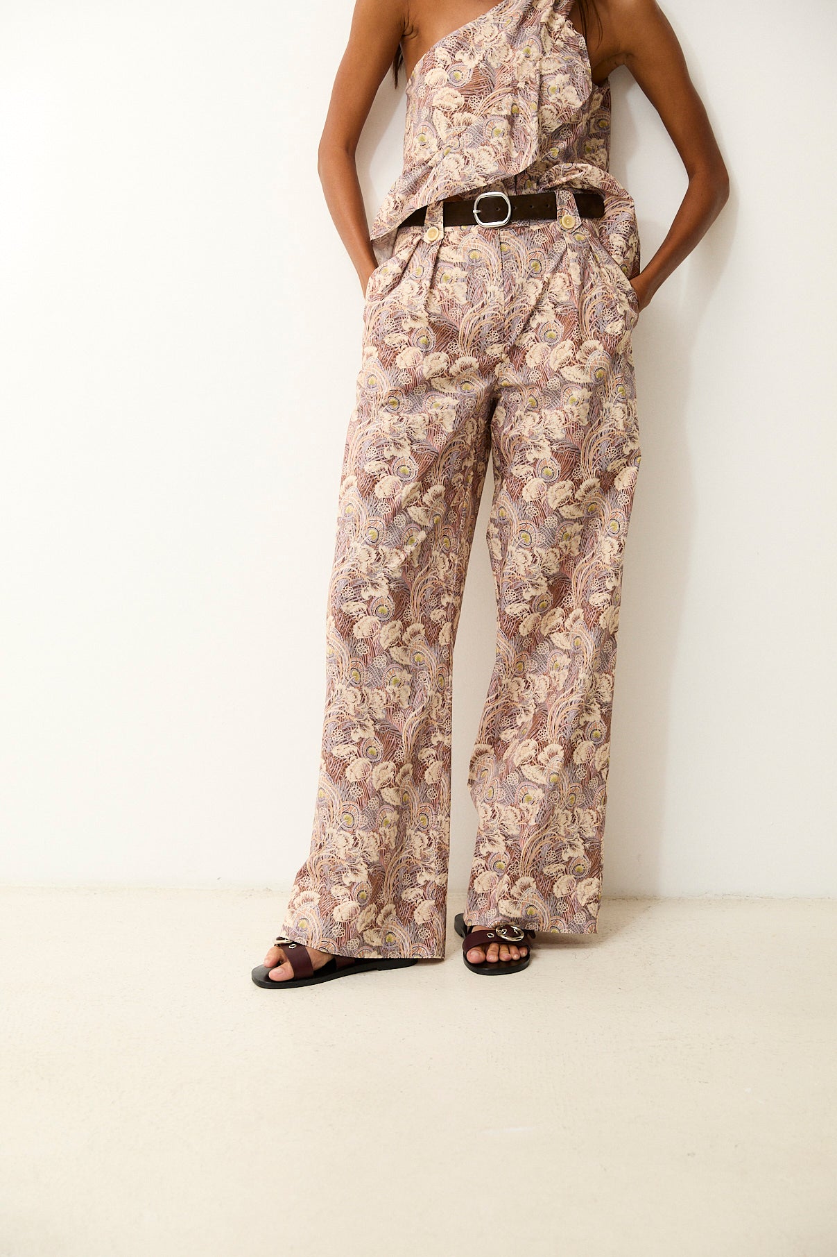 The Hana trousers are crafted from 100% Liberty cotton, renowned for its rich prints and exceptional softness. Their fluid, mid-to-high rise silhouette offers both comfort and elegance, perfect to pair with the matching top for a distinctive look.