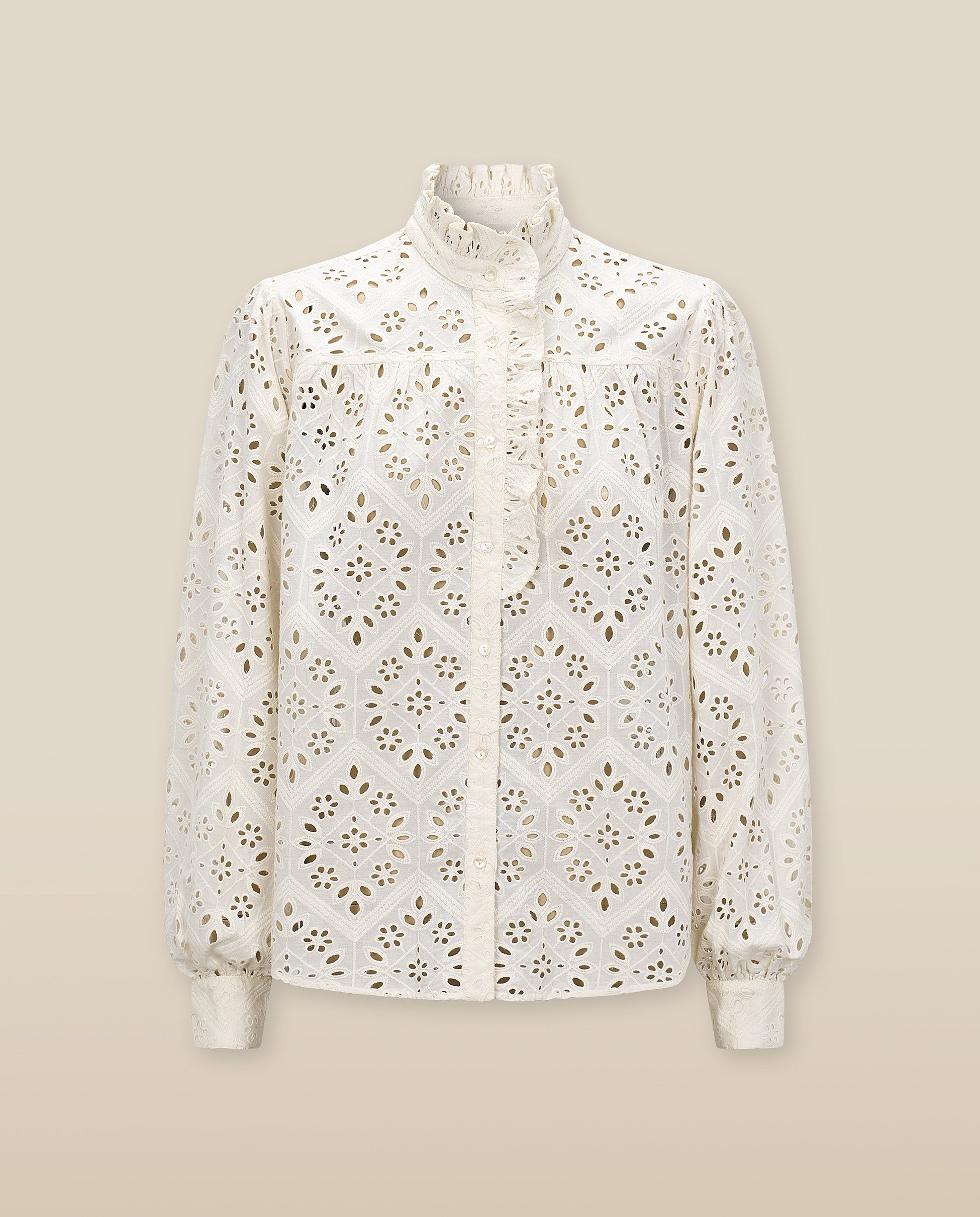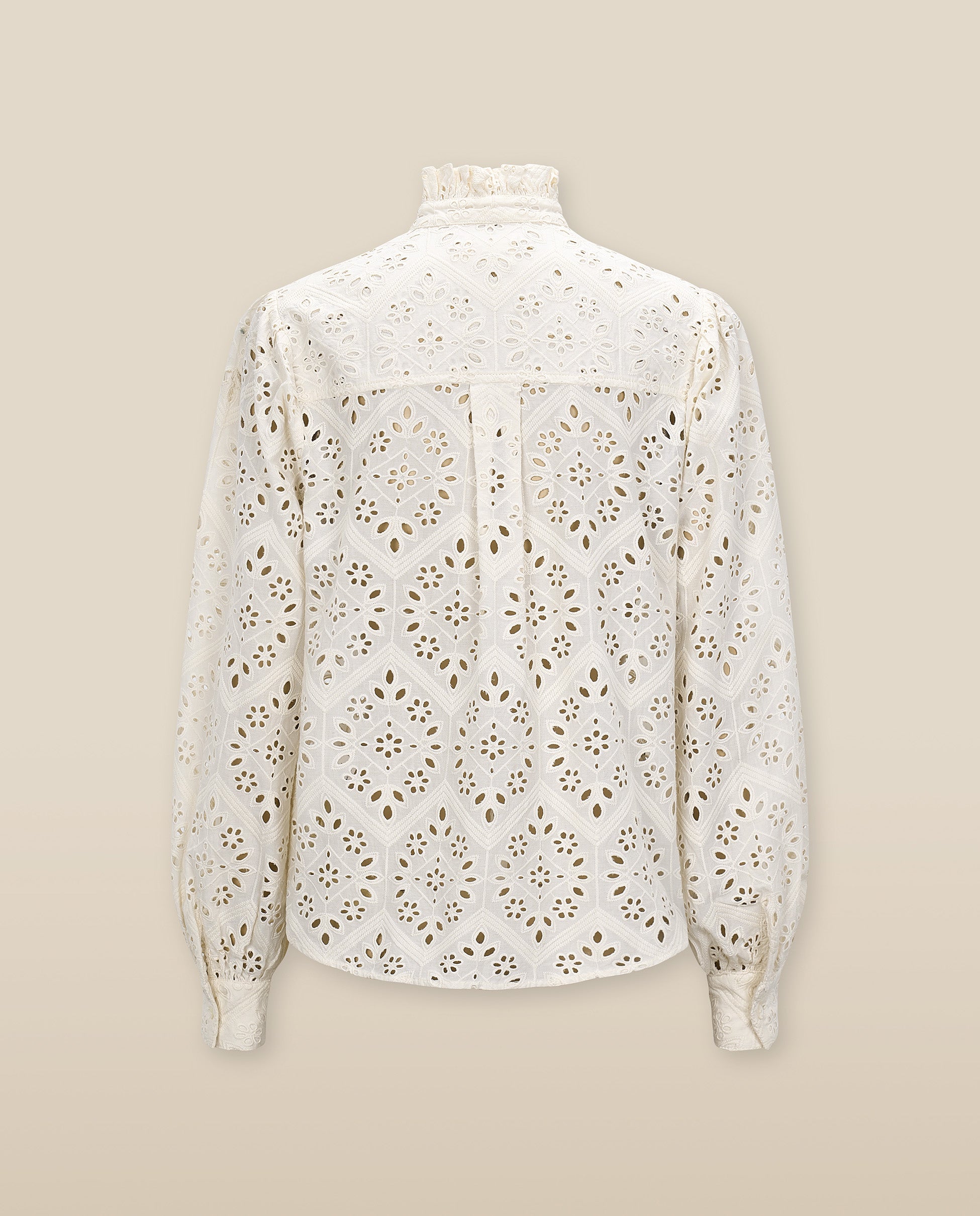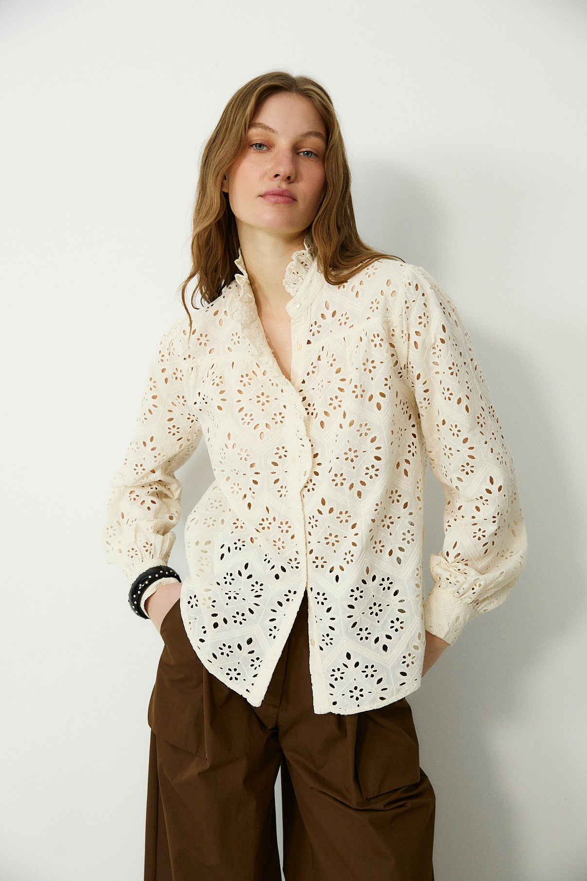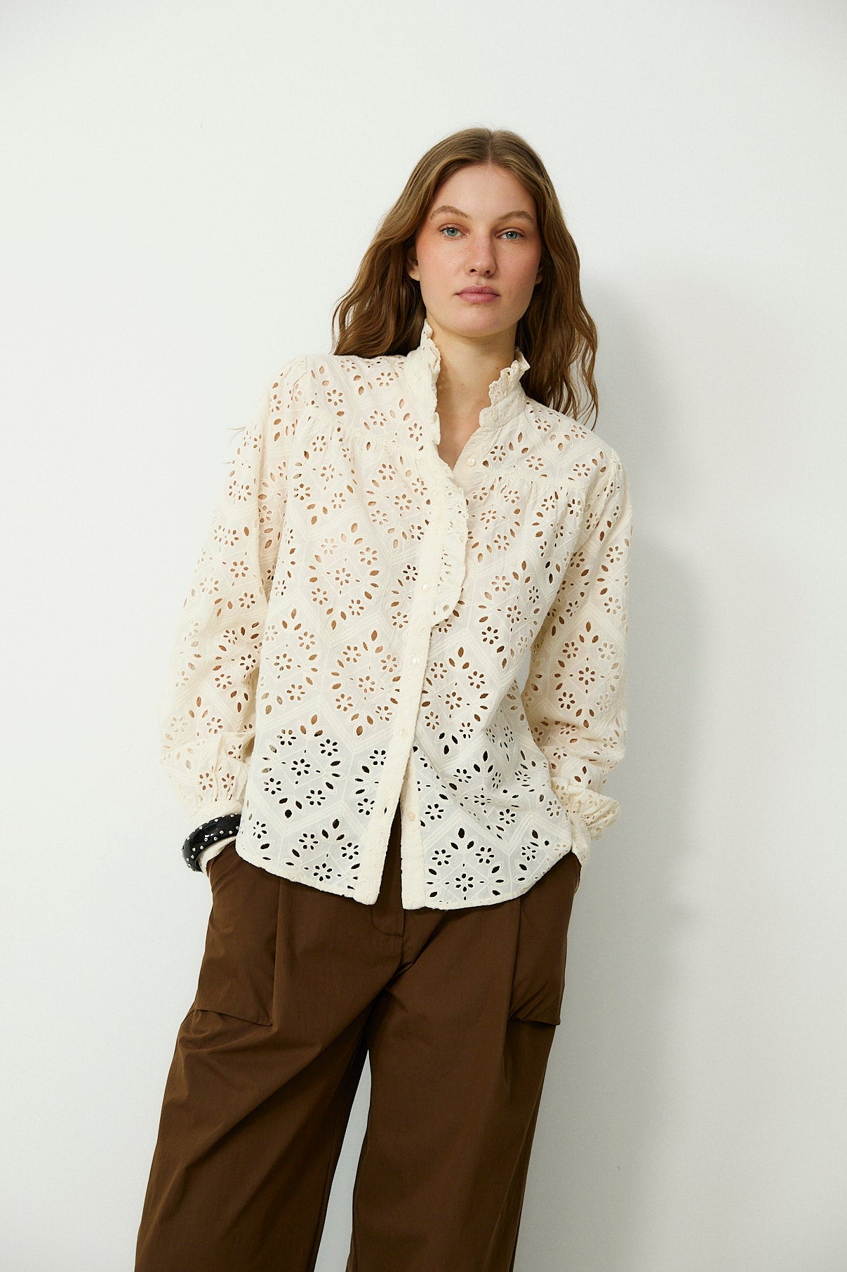 Günlük giyime romantik bir bakış açısı getiren Lulu Bluz ile gardırobunuza taze bir bohem havası katın. Havadar broderie anglaise pamuklu kumaştan üretilen bu bluz, fırfırlı kenar ve narin kesim işçiliğiyle zarif bir yüksek yakaya sahiptir. Yumuşak bir şekilde toplanmış omuzlar tam boy kollara dönüşerek konfor ve zarafet arasında mükemmel bir denge kurar. Düğmeli ön kapatma çok yönlülük katar; günlük gündelik bir kombin için kot pantolonla eşleştirin veya zahmetsiz bir akşam görünümü için uçuşan maksi bir etekle süsleyin.