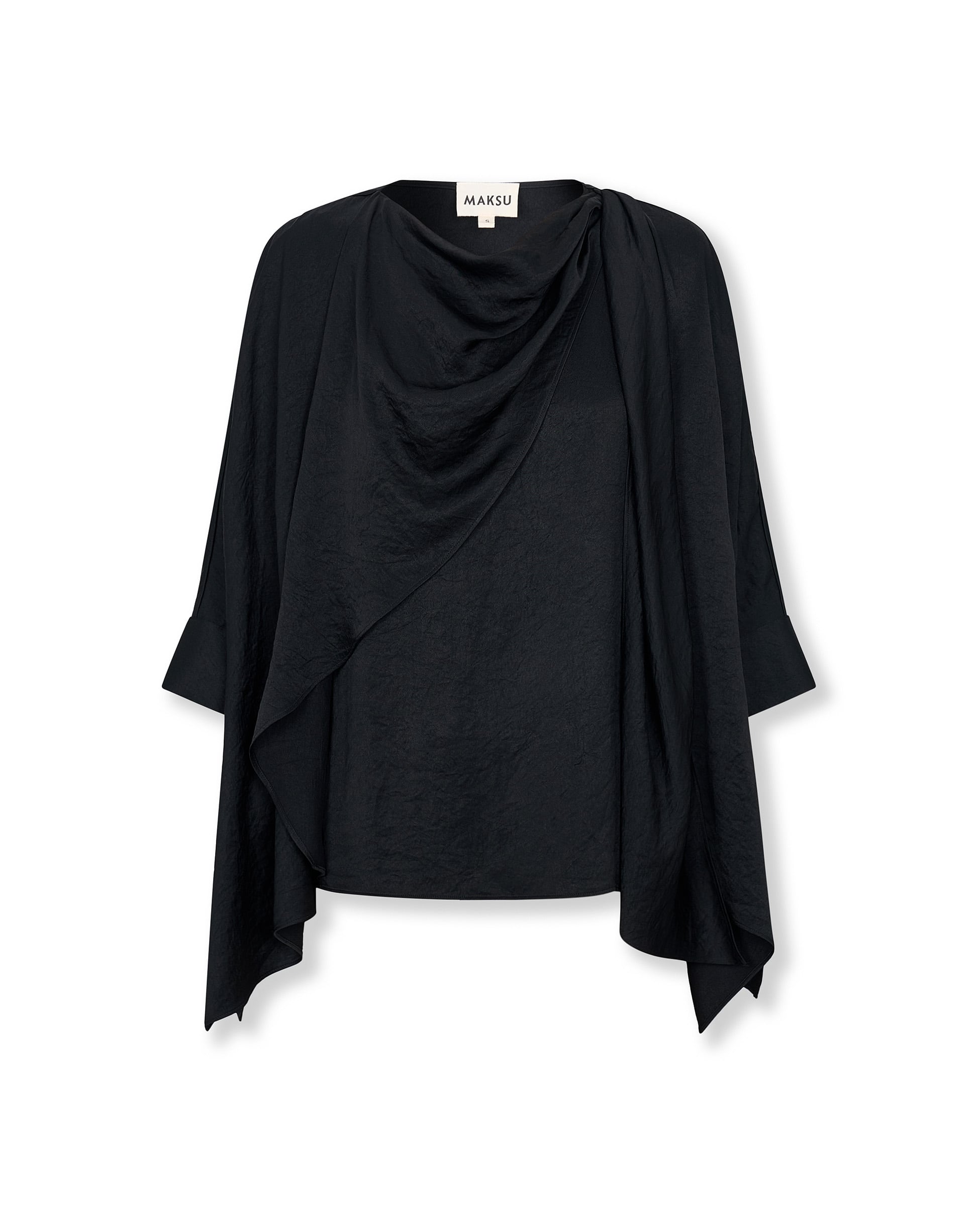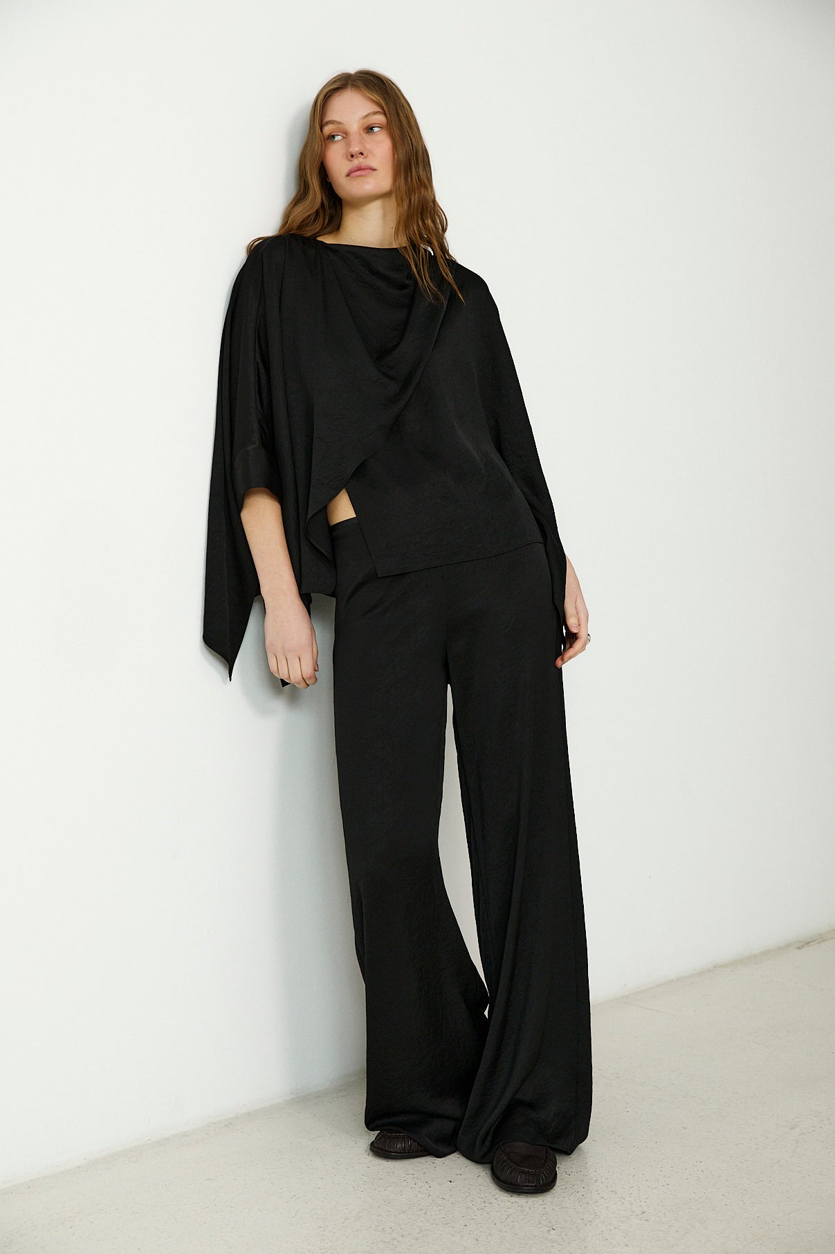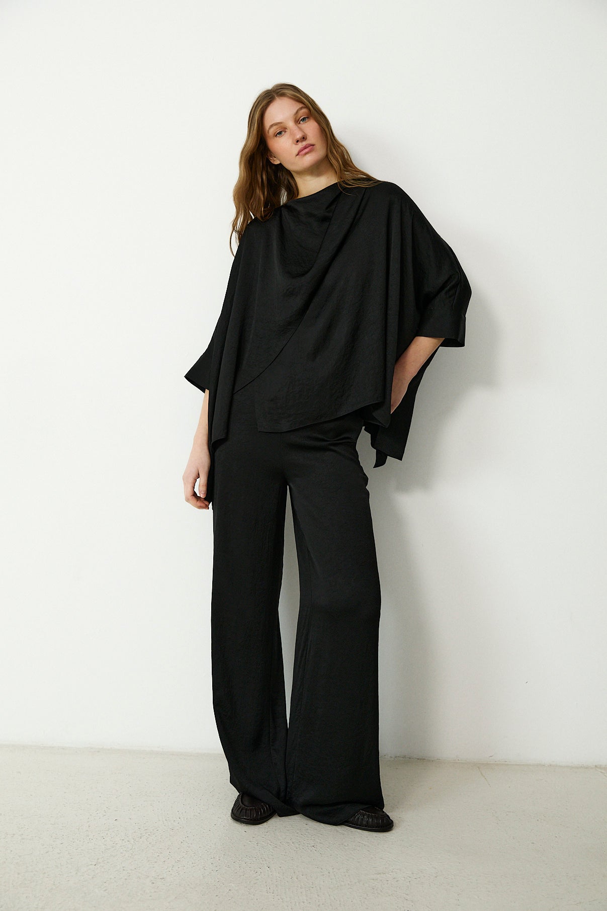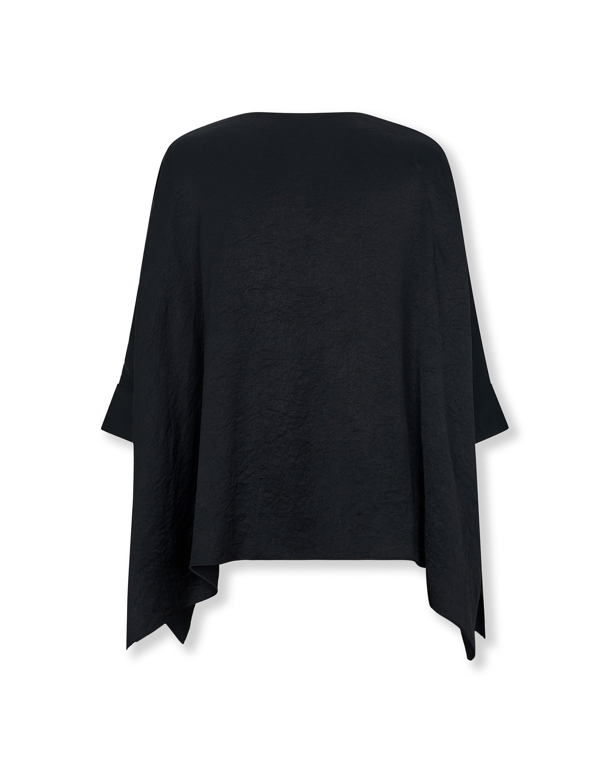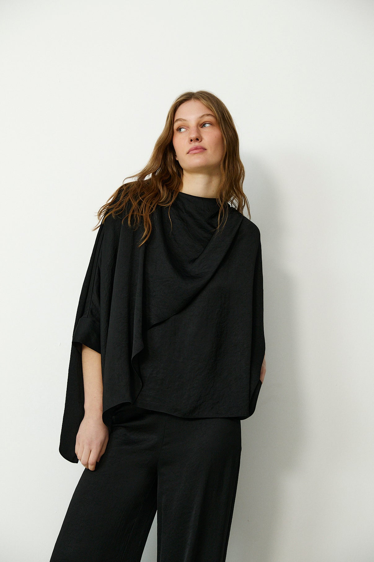 Minimal and sculptural, the Tirso blouse is defined by its fluid silhouette and softly textured finish. Cut with a draped crew neckline and asymmetric front panel, it features cape-style sleeves that fall in gentle folds for a sense of effortless movement. A refined choice for day or evening dressing.