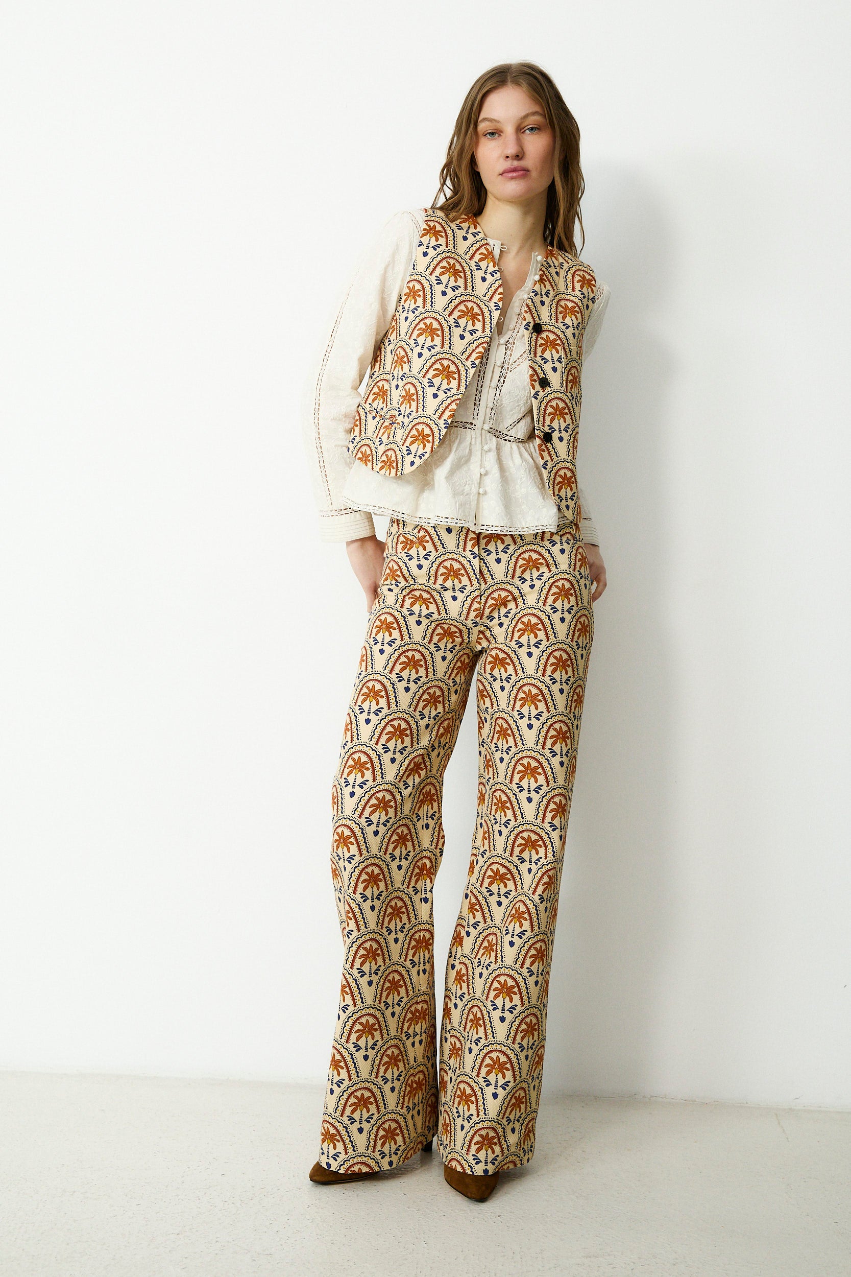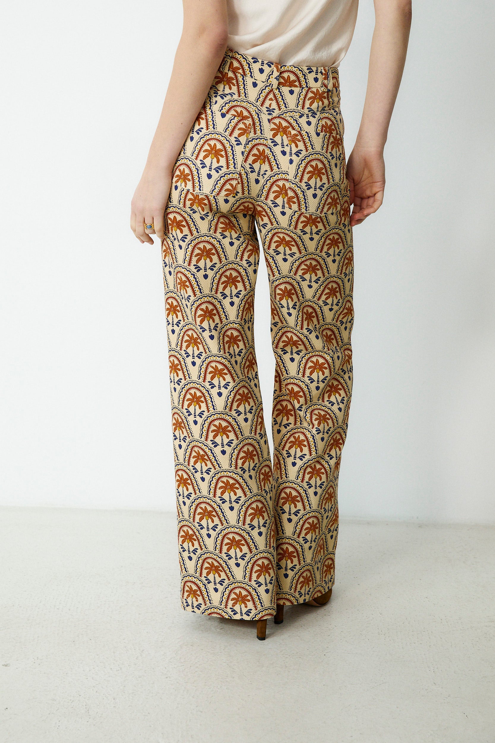 Crafted from 100% cotton, the Connie trousers bring a bold yet effortless feel to everyday dressing. Designed with a flattering high-rise waist and a wide-leg silhouette, they feature an all-over graphic print in warm, contrasting tones that adds character and visual interest. Finished with a clean front fastening and a fluid drape through the leg, they pair perfectly with the Connie vest or simple tops for a balanced, distinctive look.