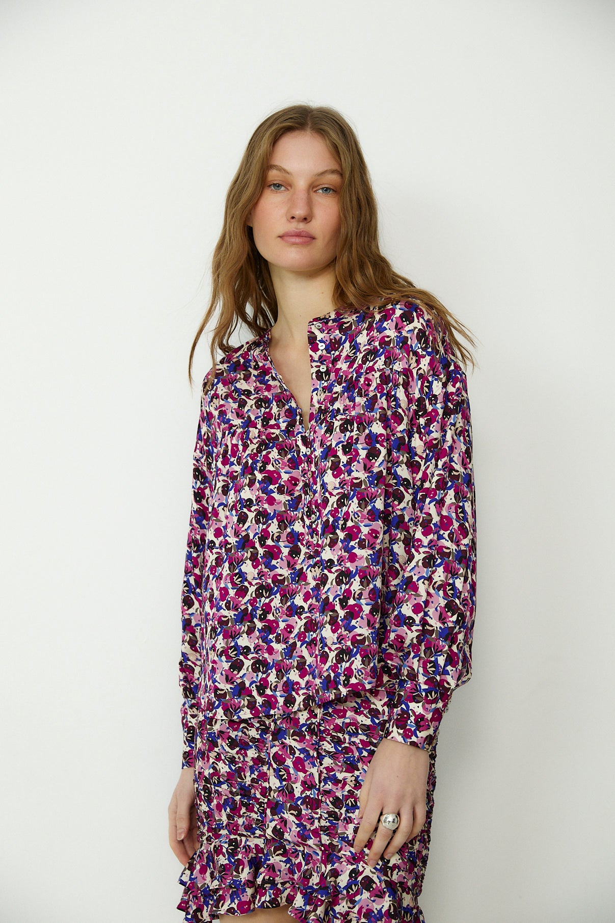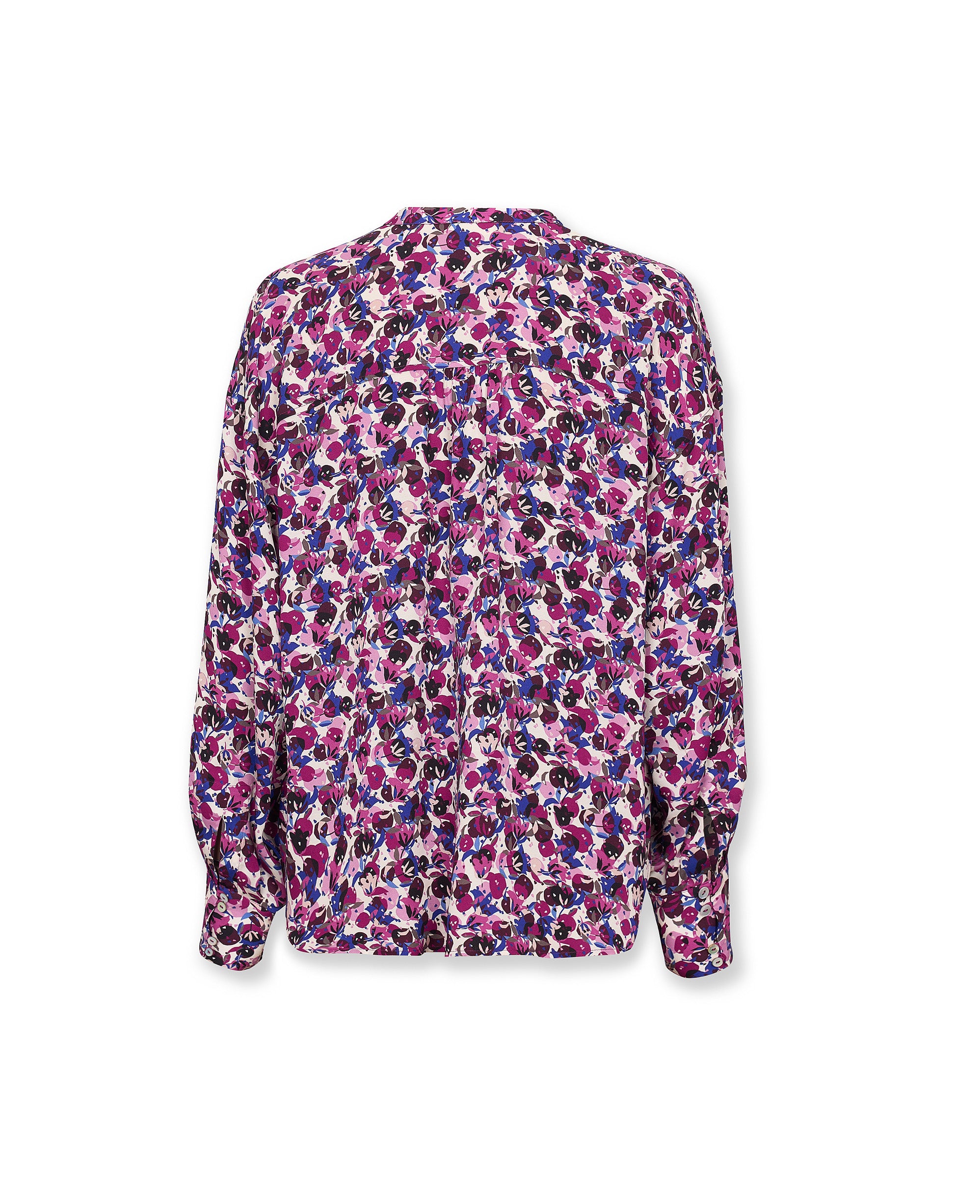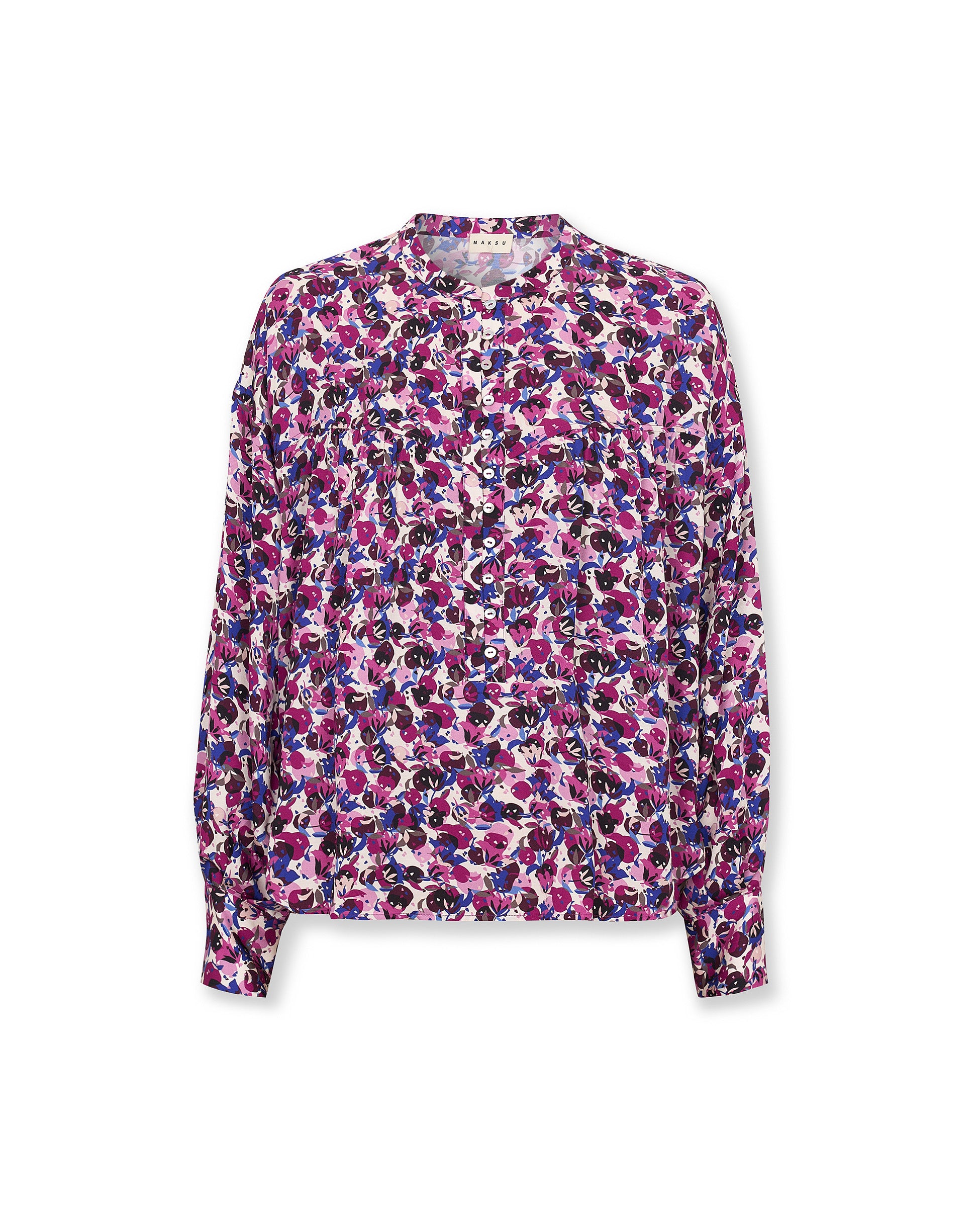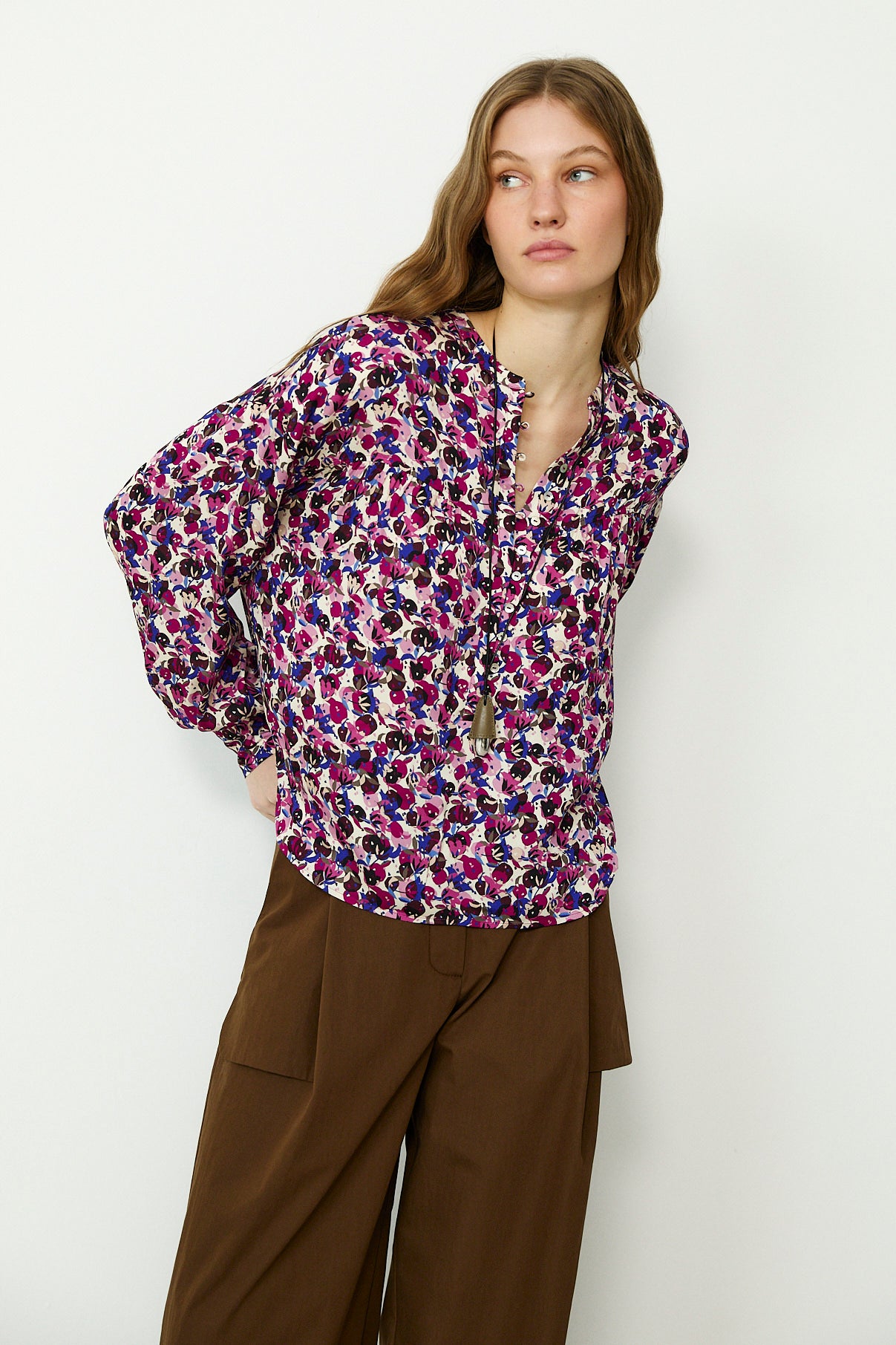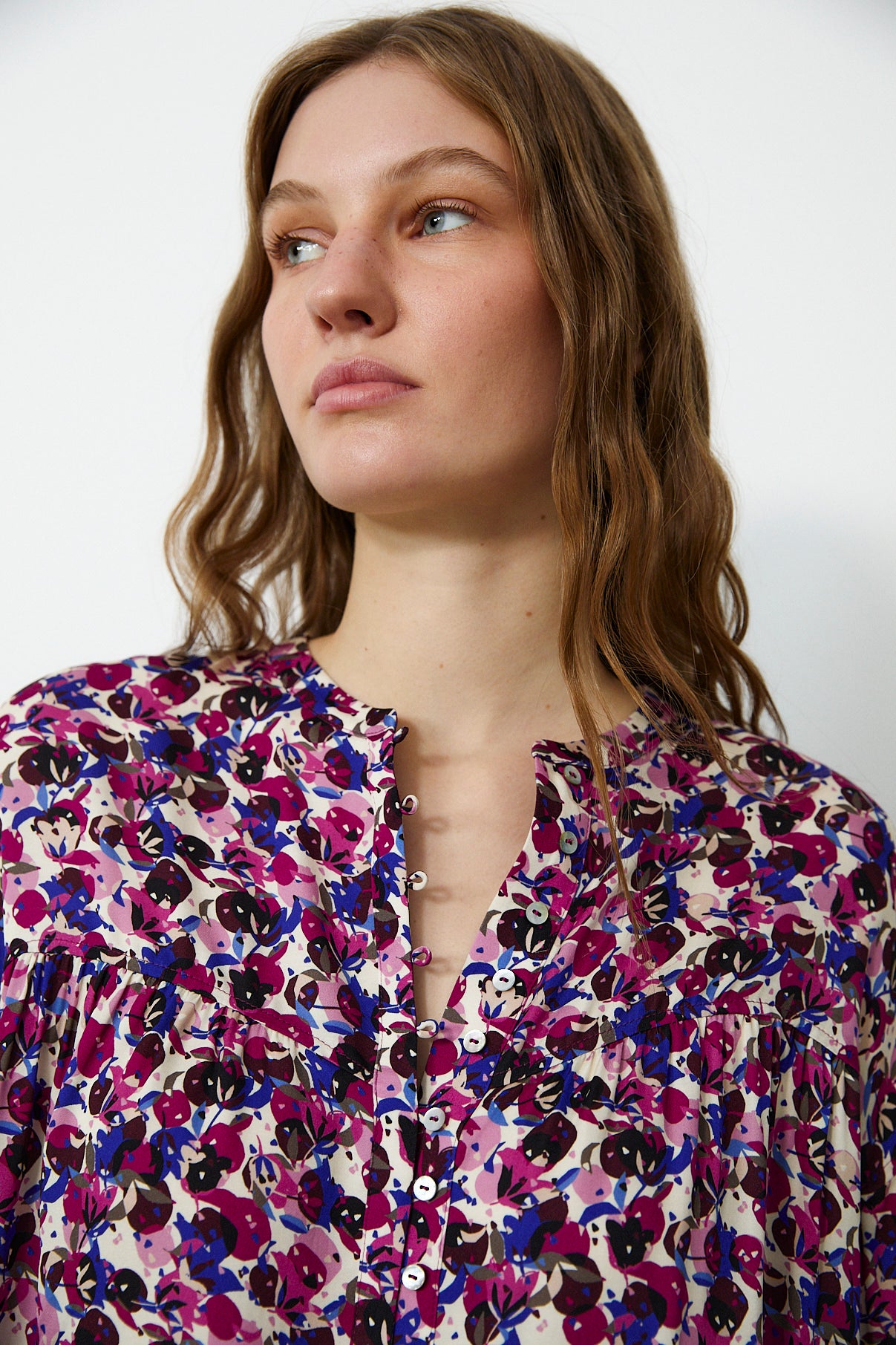 The Marieta blouse brings effortless polish to everyday dressing, crafted in an abstract magenta floral print on airy bamboo viscose. Designed with a clean band collar and a button-through front, it falls into a relaxed shape with gentle gathers through the yoke. Wear it loose over denim or tucked into tailored trousers.