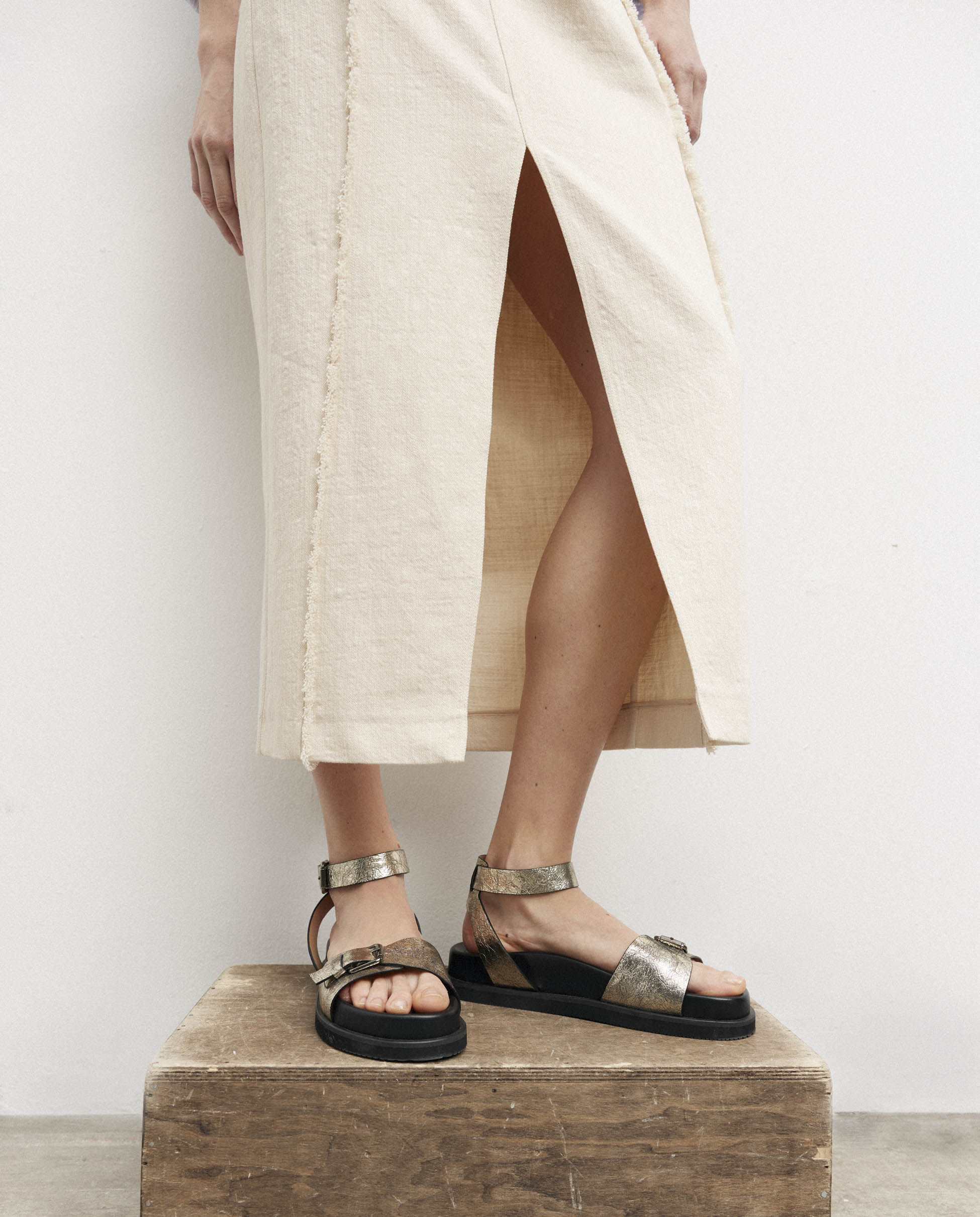 Gümüş renkli Kim kadın düz bantlı sandaletler, tokalı metalik deri tasarıma sahip. Malzemenin çatlaklı stilini ve verdiği eskitilmiş görünümü çok seviyoruz. Yuvarlak burunlu, rahat siyah deri tabanlı ve bileğe kadar oturan bir kesime sahipler. Ayrıca İspanya'da üretiliyorlar.