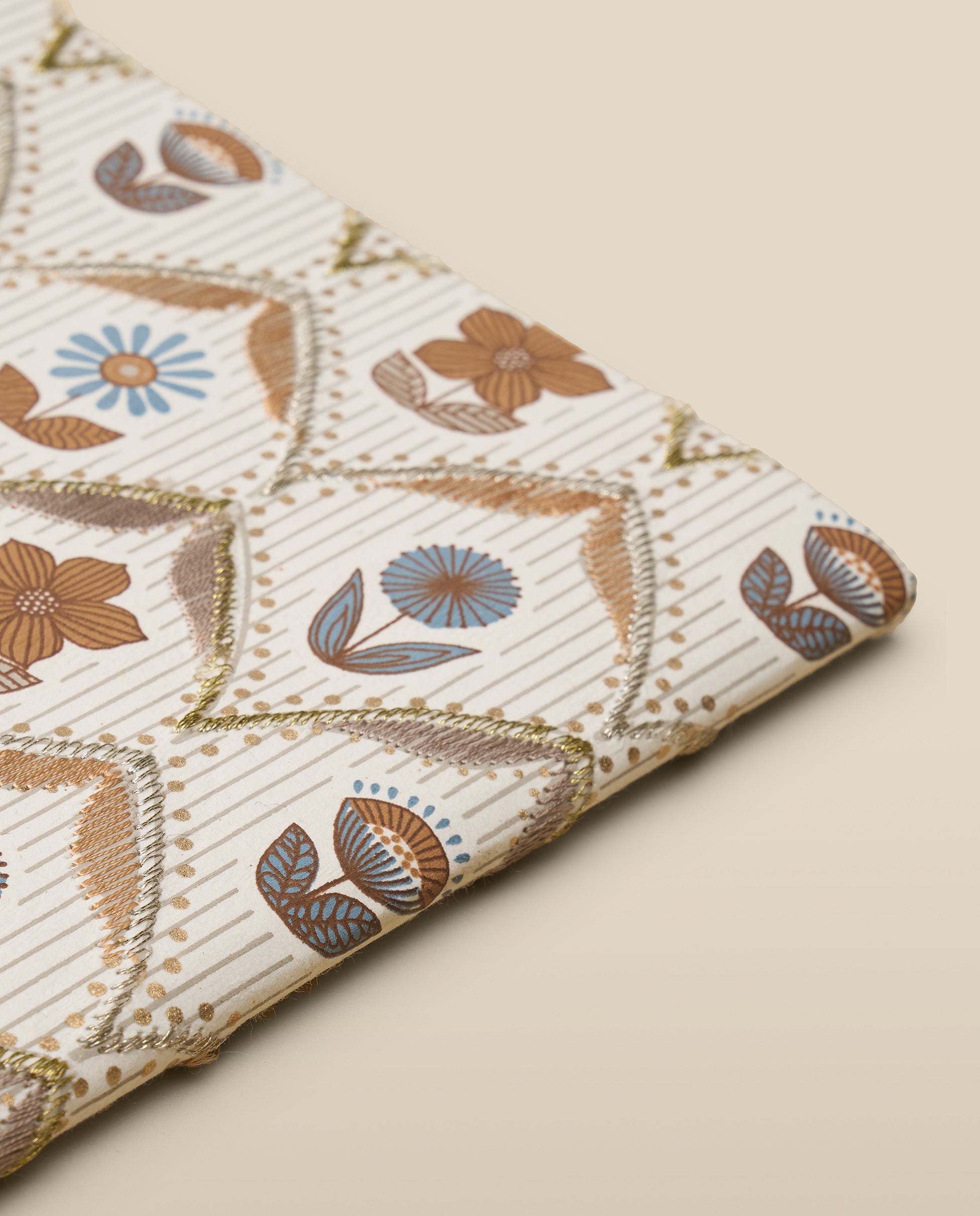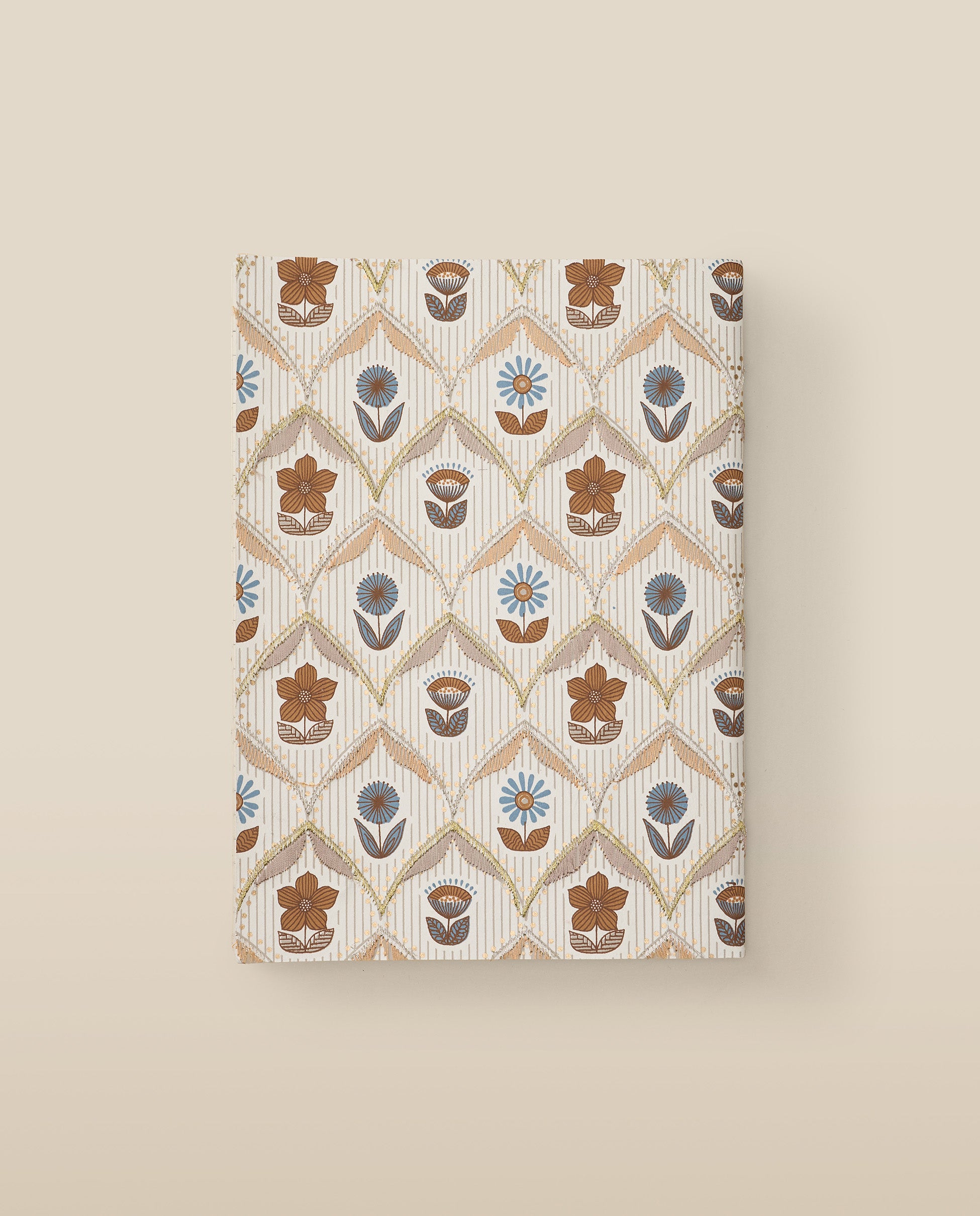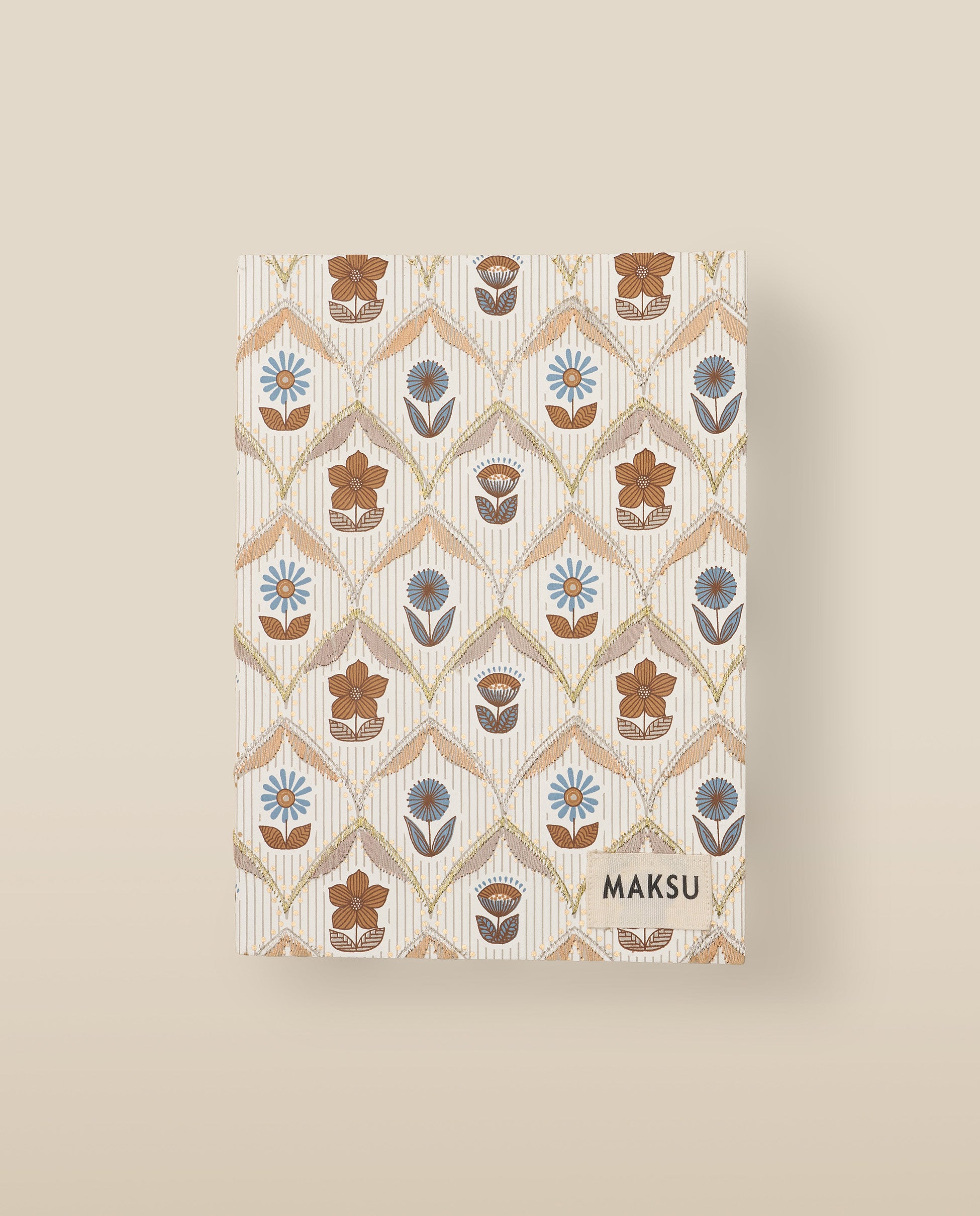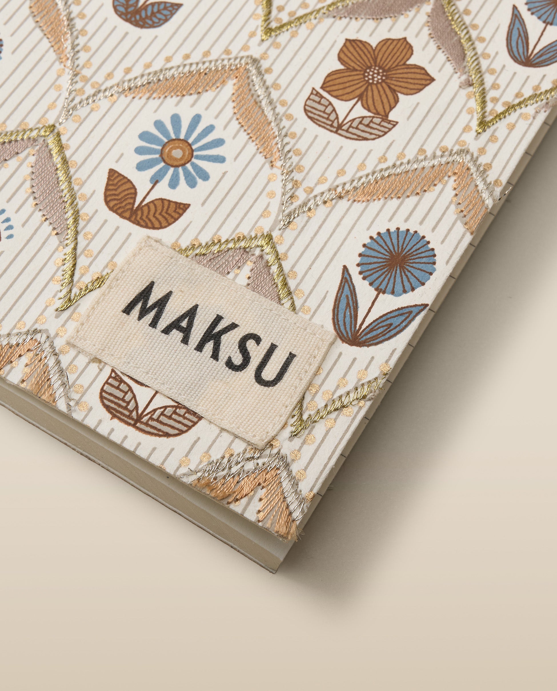 Açık krem rengi bir zemin üzerine vintage çiçek motifleriyle basılmış bu yumuşak kapaklı defter, altın, gümüş ve bakır renkli metalik iplik işlemeleriyle hayat buluyor. Masanız veya çantanız için dokunsal bir hatıra olan bu defter, 90 GSM kağıttan yapılmış 60 çizgili sayfaya sahiptir ve MAKSU imzalı pamuk etiketiyle tamamlanmıştır.
